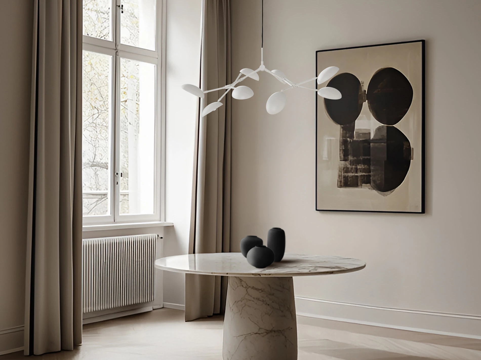From anchoring a living area or lofty hallway to illuminating a dining table or kitchen counter, the Drop’s organic form and all-white finish integrate harmoniously into different interiors - its mid-century inspired design carries its heritage into contemporary settings with ease. A maximum cable drop of five metres can make the most of vertical space, adding depth and drama to your lighting scheme.