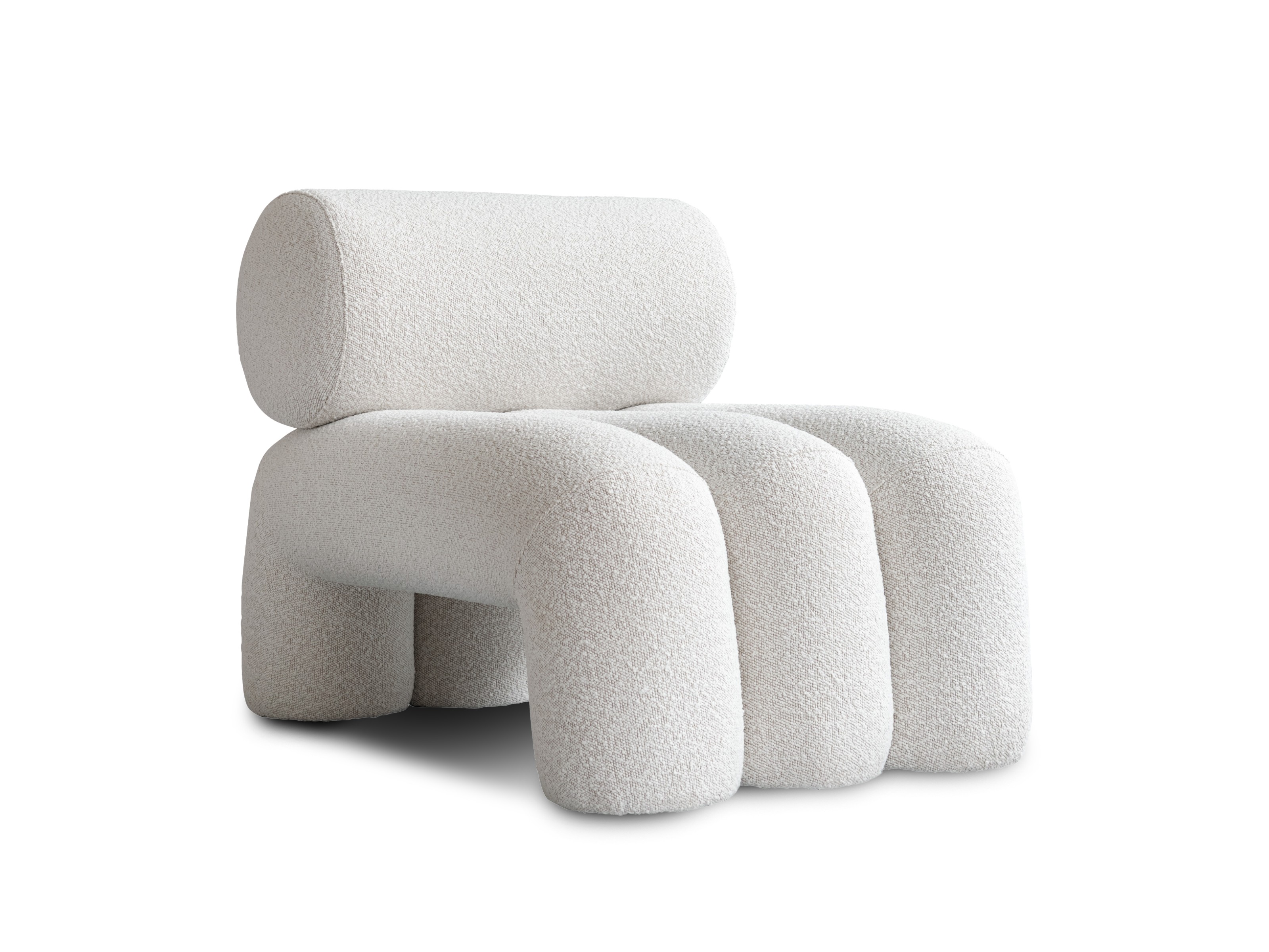 Several Foku Chairs can be combined together to create a larger sofa using the included metal brackets, which can be effortlessly mounted underneath with a small screw. This version of the chair is upholstered in an off-white bouclé, while an outdoor-friendly version is also available.