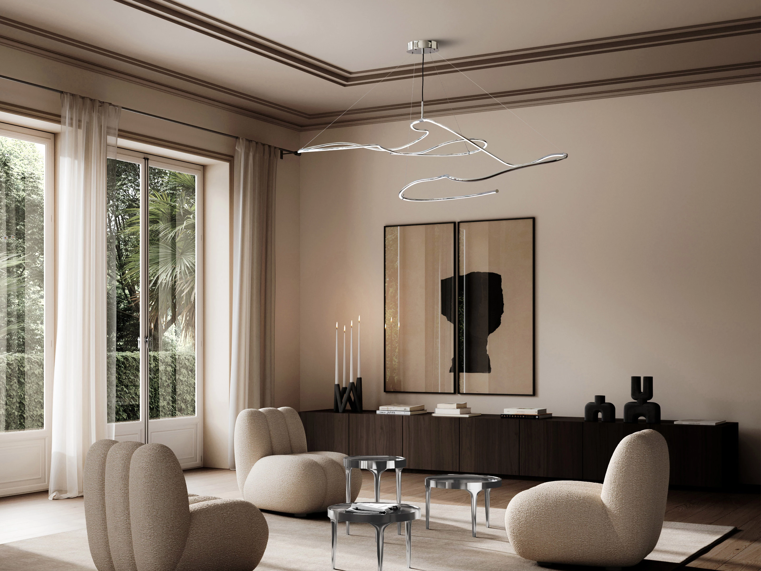 With its sculptural form and refined simplicity, the chrome Ghost Chandelier makes a daring statement in any modern setting. Serpentine chrome contours and radiant white LED tubes create a captivating display of light, drawing the eye with its dynamic elegance.