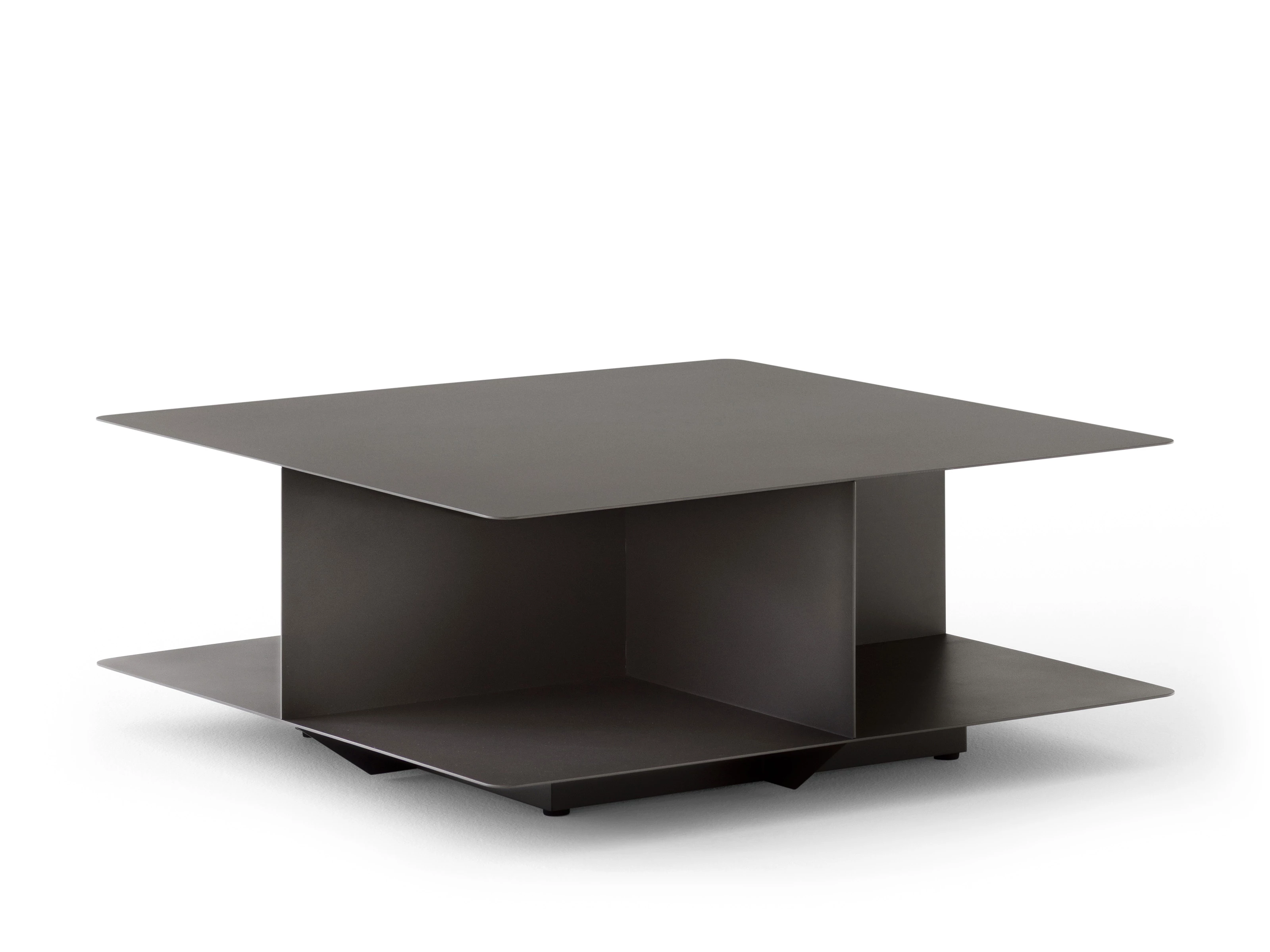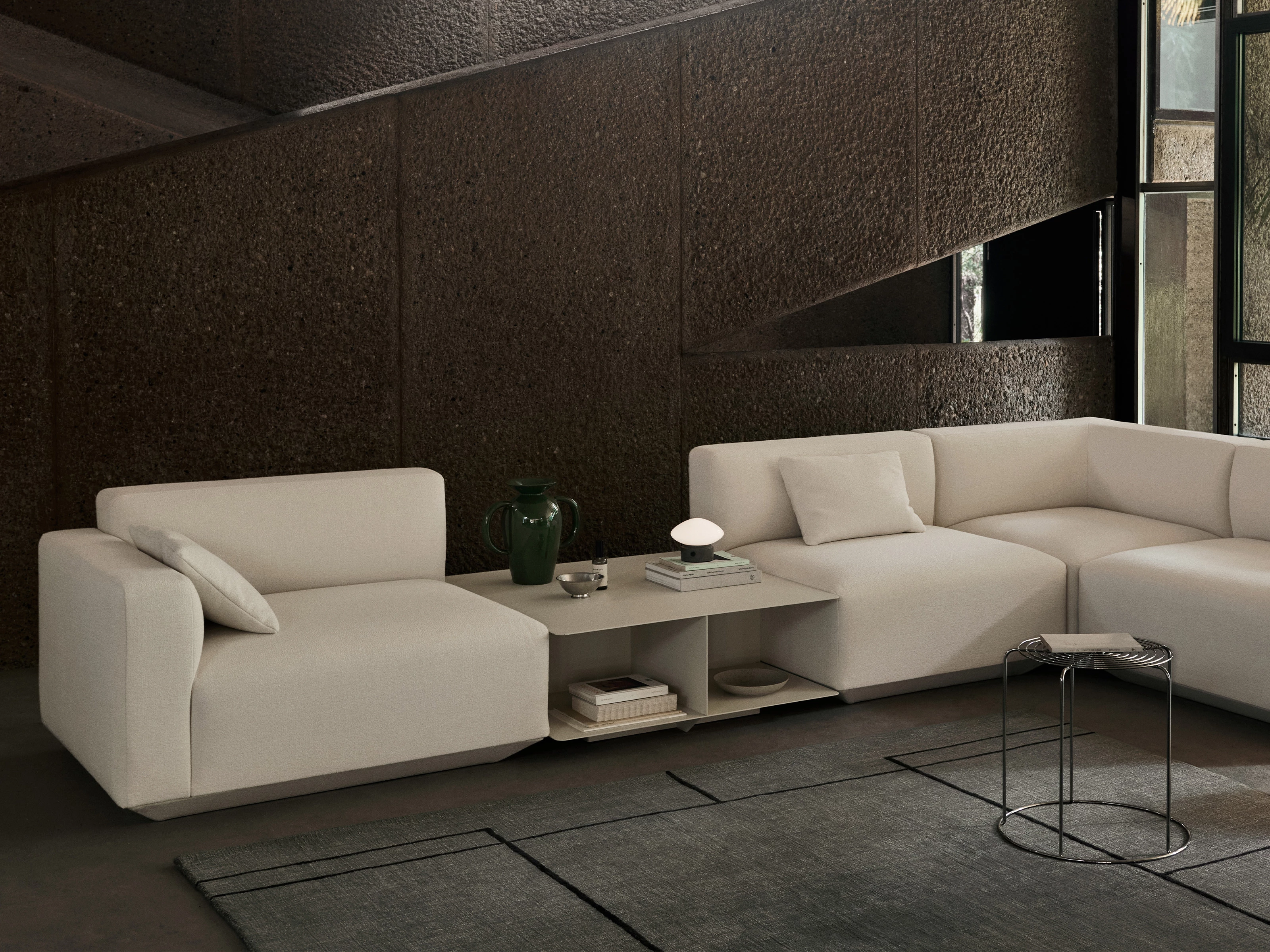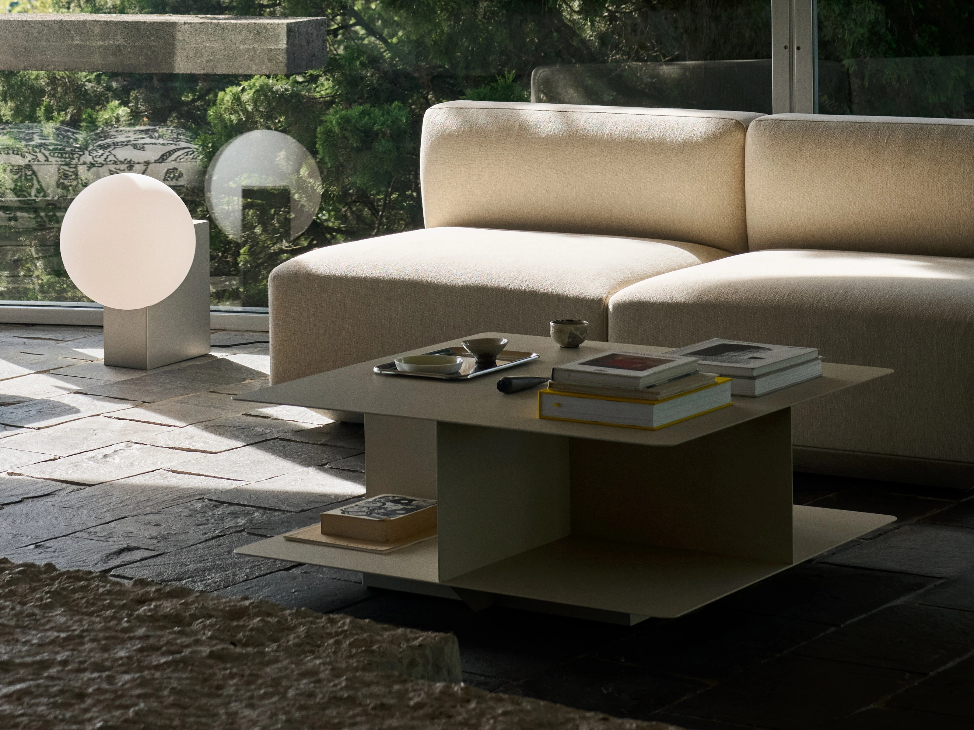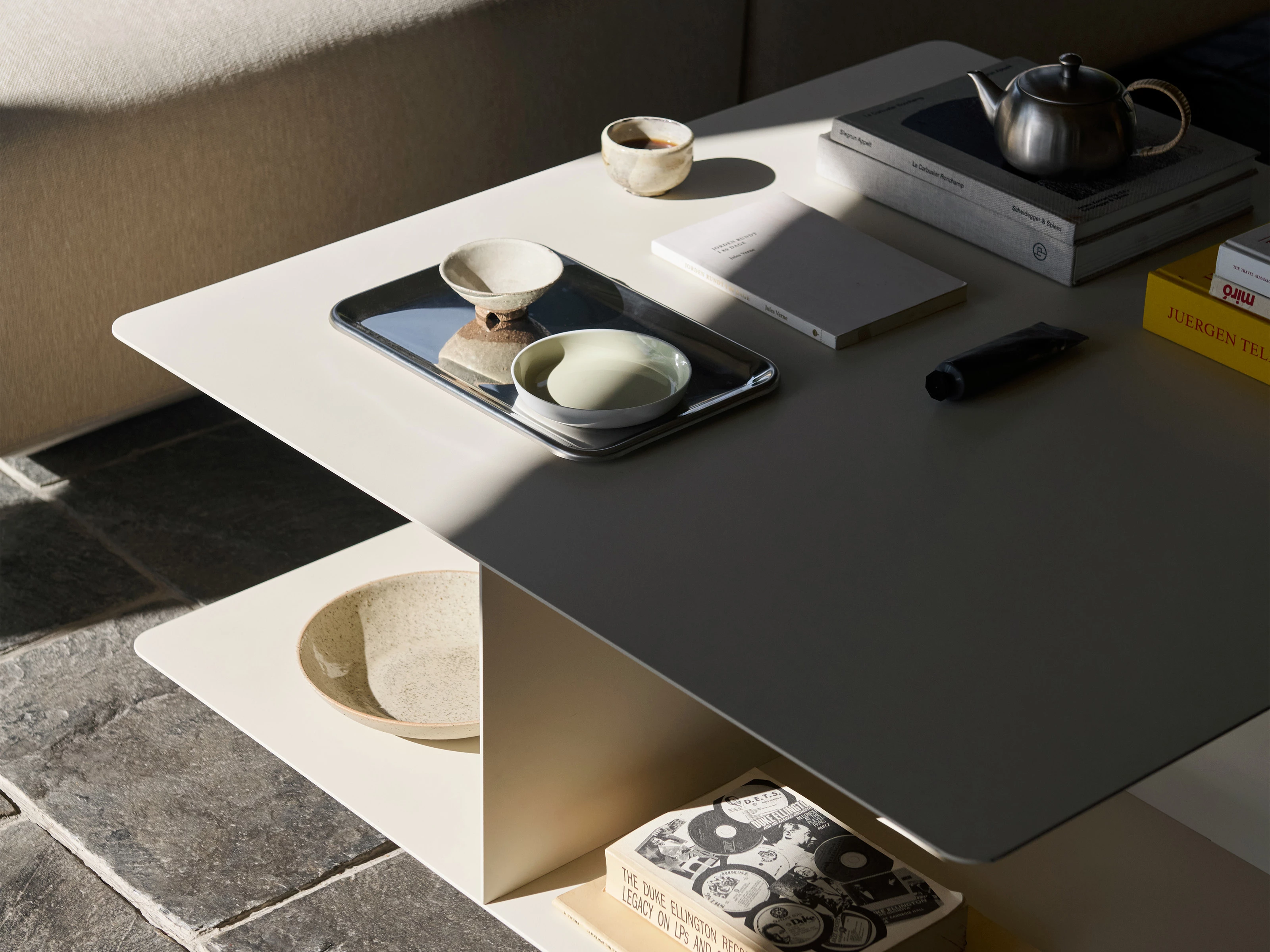 Positioned alone or integrated seamlessly with Develius sofa modules, the coffee table offers a generous surface and discreet storage in one composed form. Made of solid, powder-coated steel and available in a choice of colourways, the piece is perfect for books, design objects or everyday essentials, bringing order, elegance and a sense of calm to contemporary lounge settings.