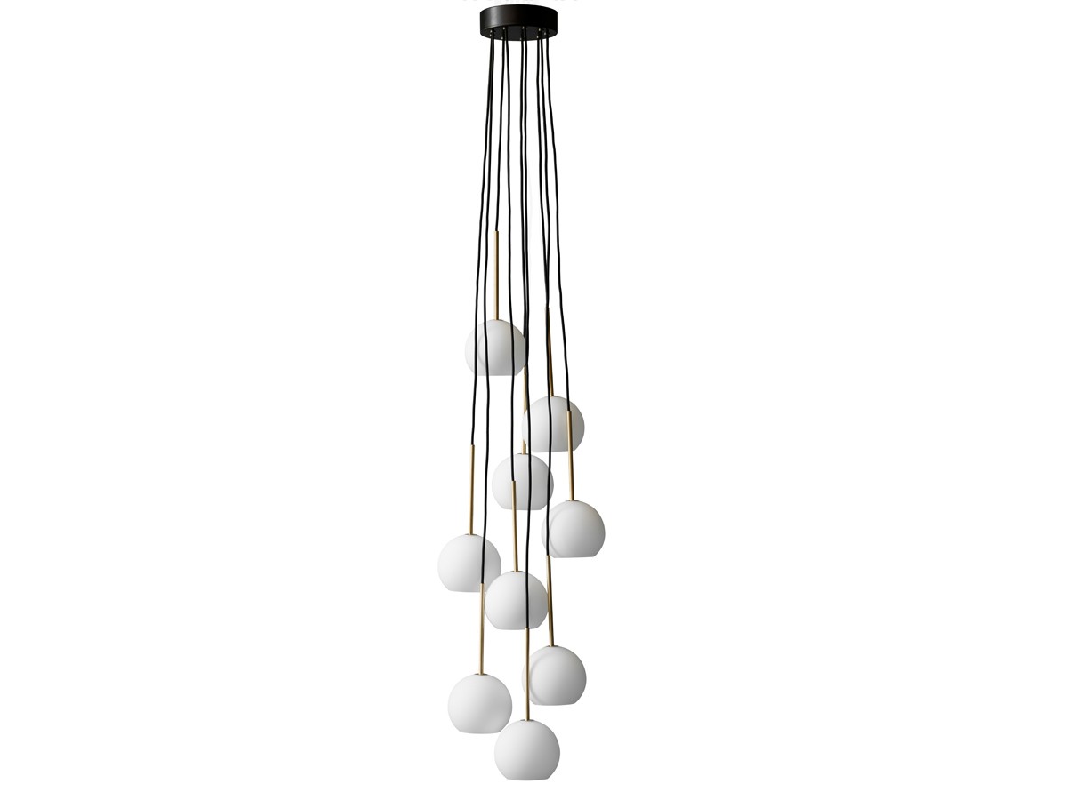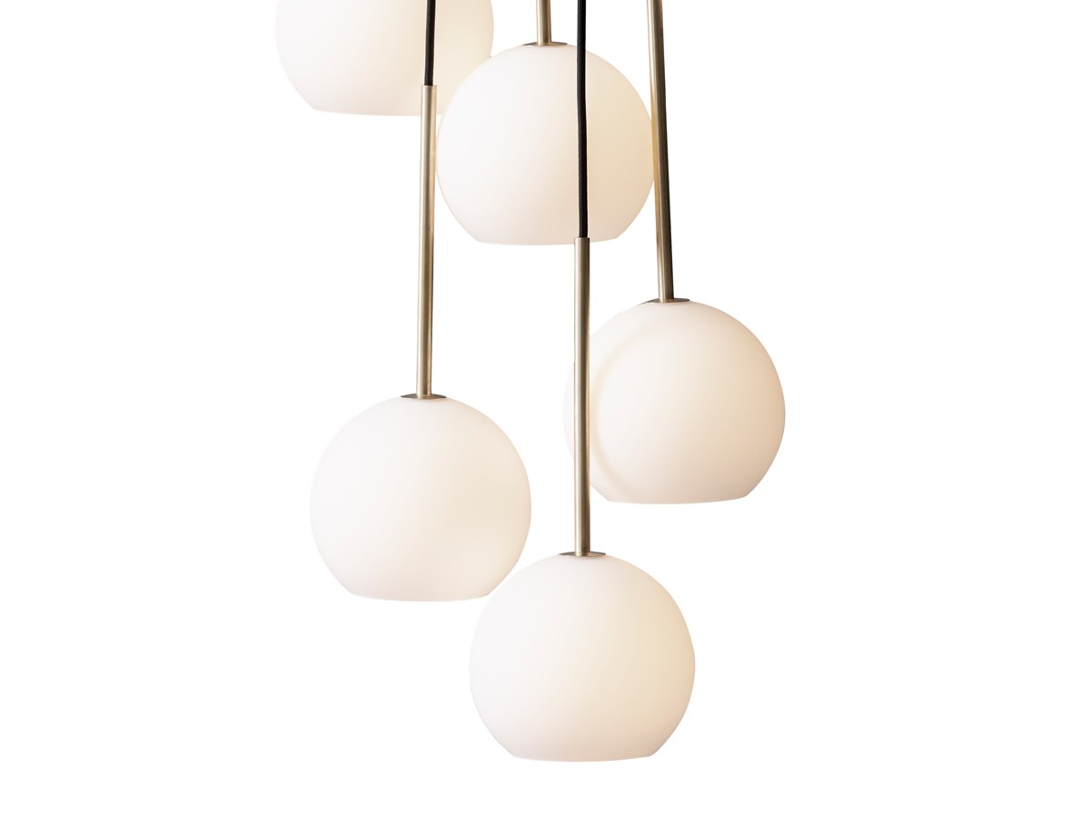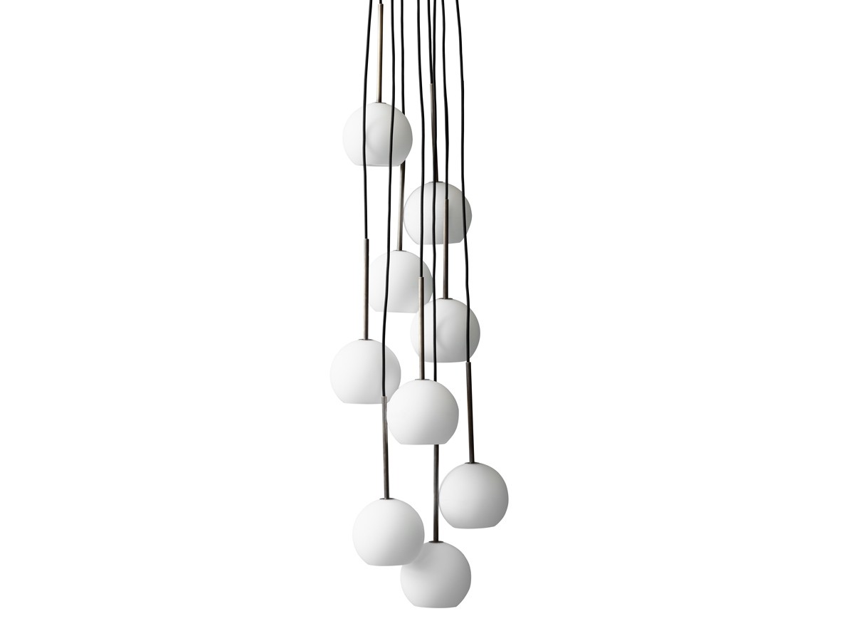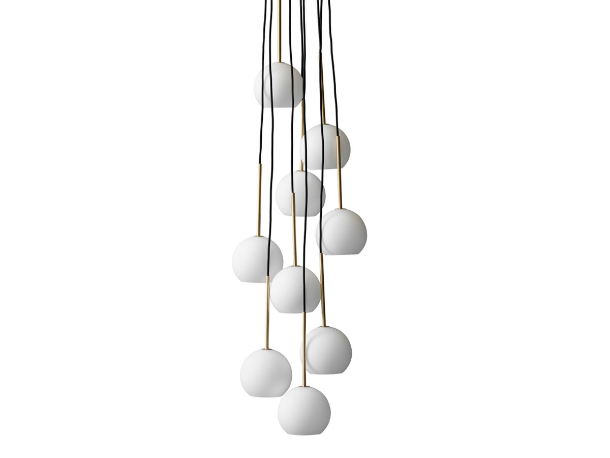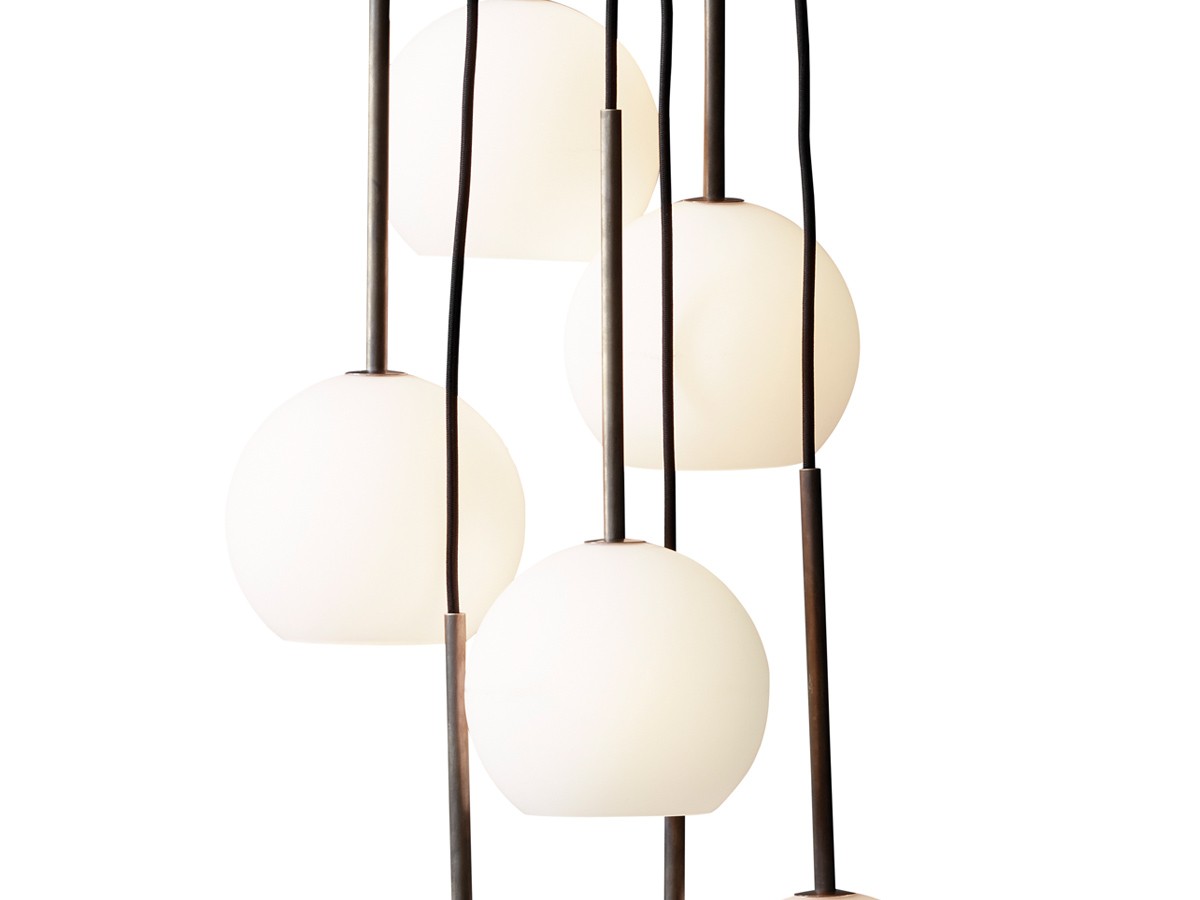 "ice chandelier has a simple, timeless look but creates an extraordinary mood in the room at the same time." - Sofie Refer. A cluster of scintillating bulbous pendants, it preserves the lavish appeal of that archetypal luminaire. Yet, Ice Chandelier’s asymmetrical configuration and simple, unembellished glass globes bring its aesthetic right up to date. The chandelier consists of a circular canopy from which nine pendants hang. They are encased by hand-blown glass globes, each of which is unique in its character; evidence of the craftsman’s intervention in the manufacturing process. Available as a single pendant.