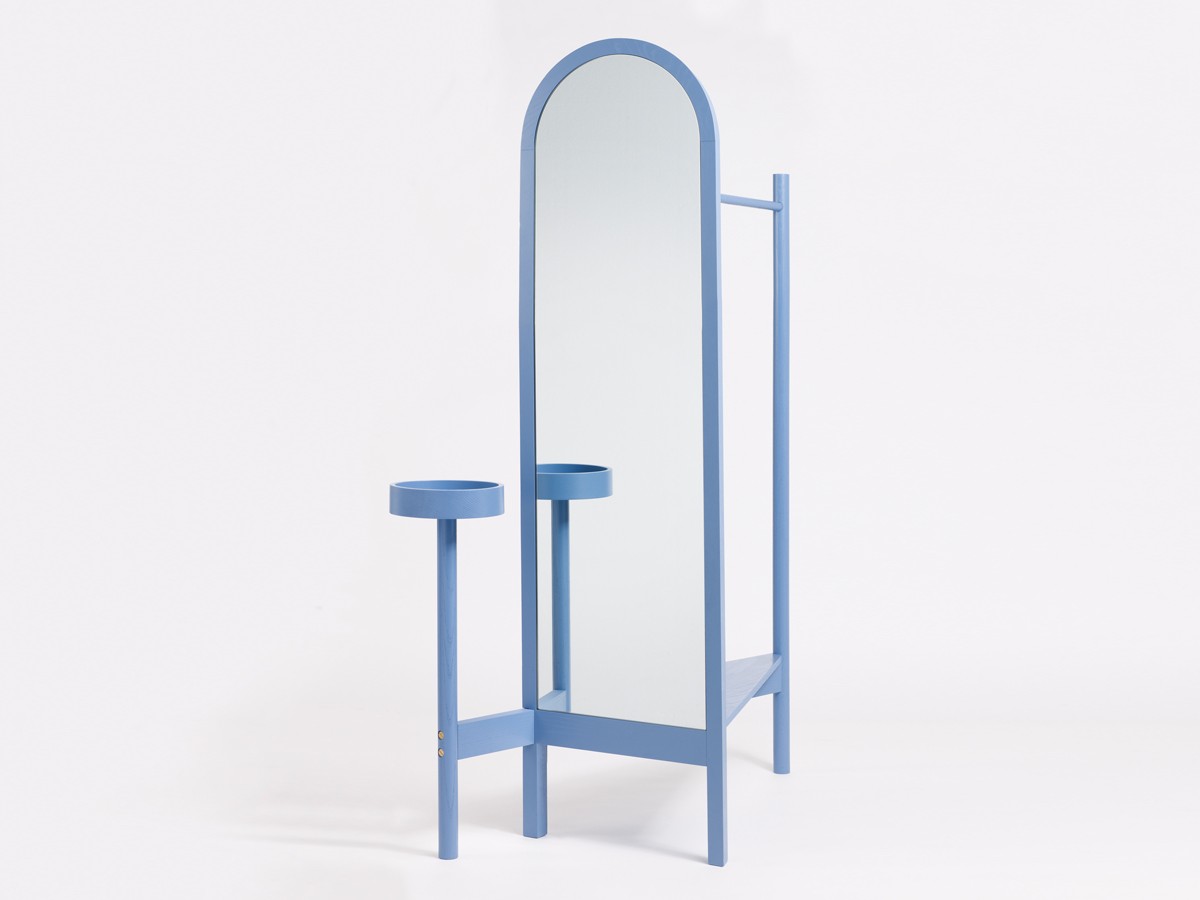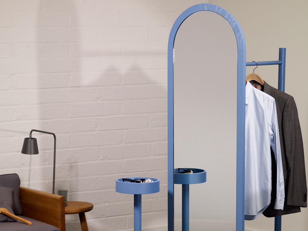 The arching clothes rail, which incorporates a full-length mirror and vanity shelf, builds on his previous explorations of creating structures that work to define a larger space.