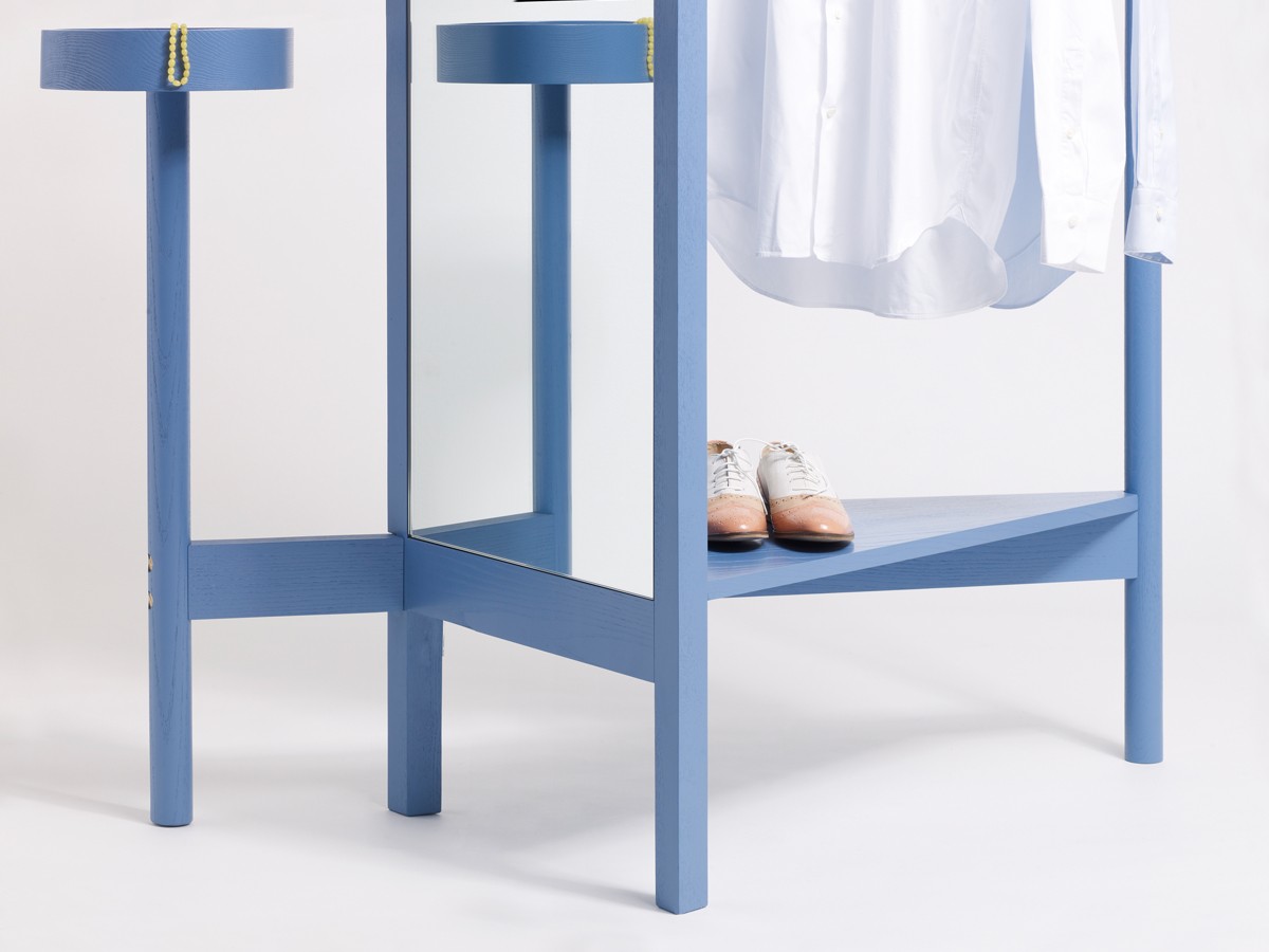 Together, the all-encompassing dressing unit forms a worthy alternative to what might be typically found in the bedroom. Despite its straightforwardness, there is still a theatrical thread in the piece; from the front, most of the stretched wooden rail is hidden from view.