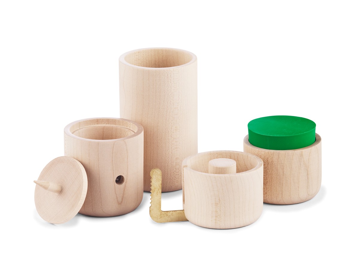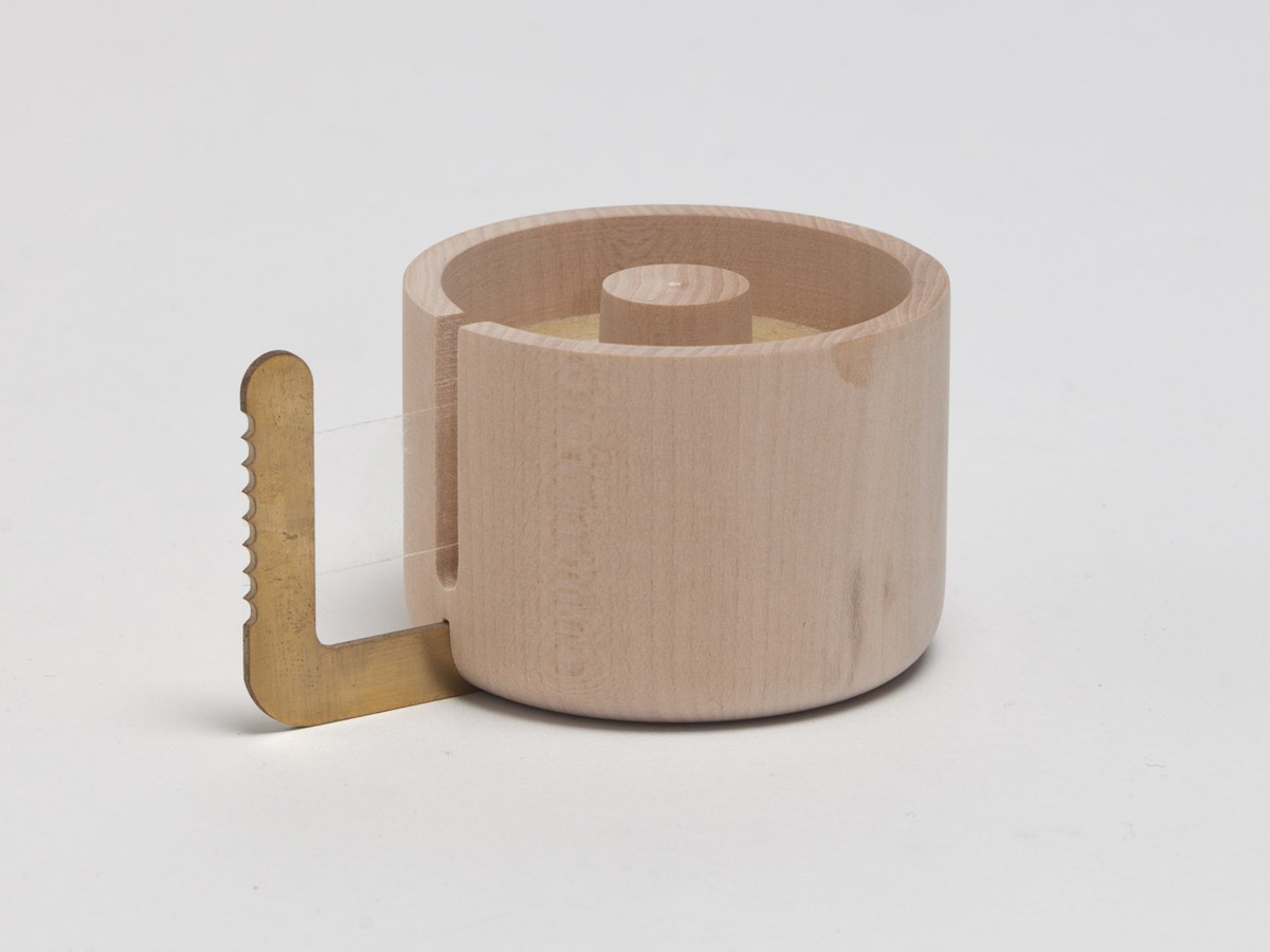A tall Pencil Pot to hold all writing ephemera, a Sharpener Pot (with motif handle) that neatly collects your shavings, a Tape Dispenser with utilitarian brass serrated arm and, lastly, a small container; Eraser Pot, for all your loose bits, with a particularly handy lid in the form of a large eraser.