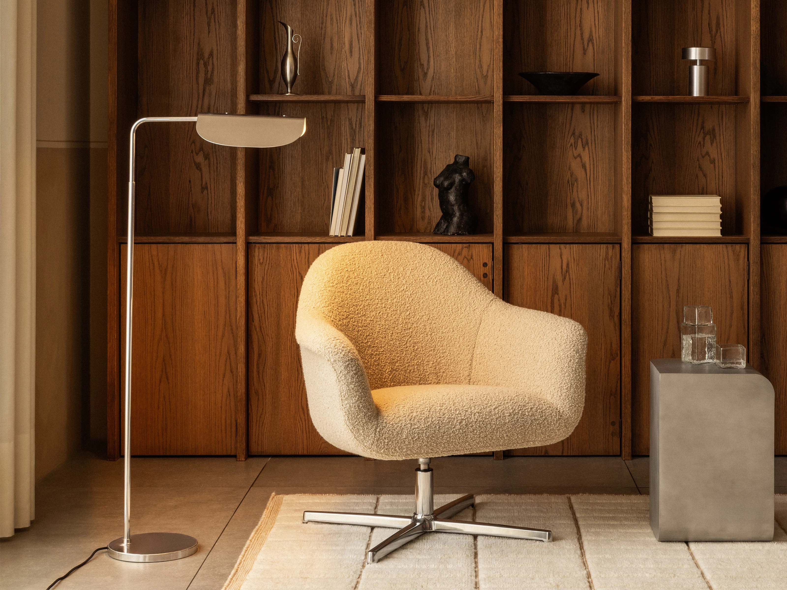 Rotate and tilt the shade to shape soft, glare-free light exactly as you wish and choose from a polished or bronzed aluminium finish to suit your space. Placed beside a sofa or lounge chair, the Wing Floor Lamp brings sculptural elegance and calm focus to your home, allowing you to experience light as both function and art.