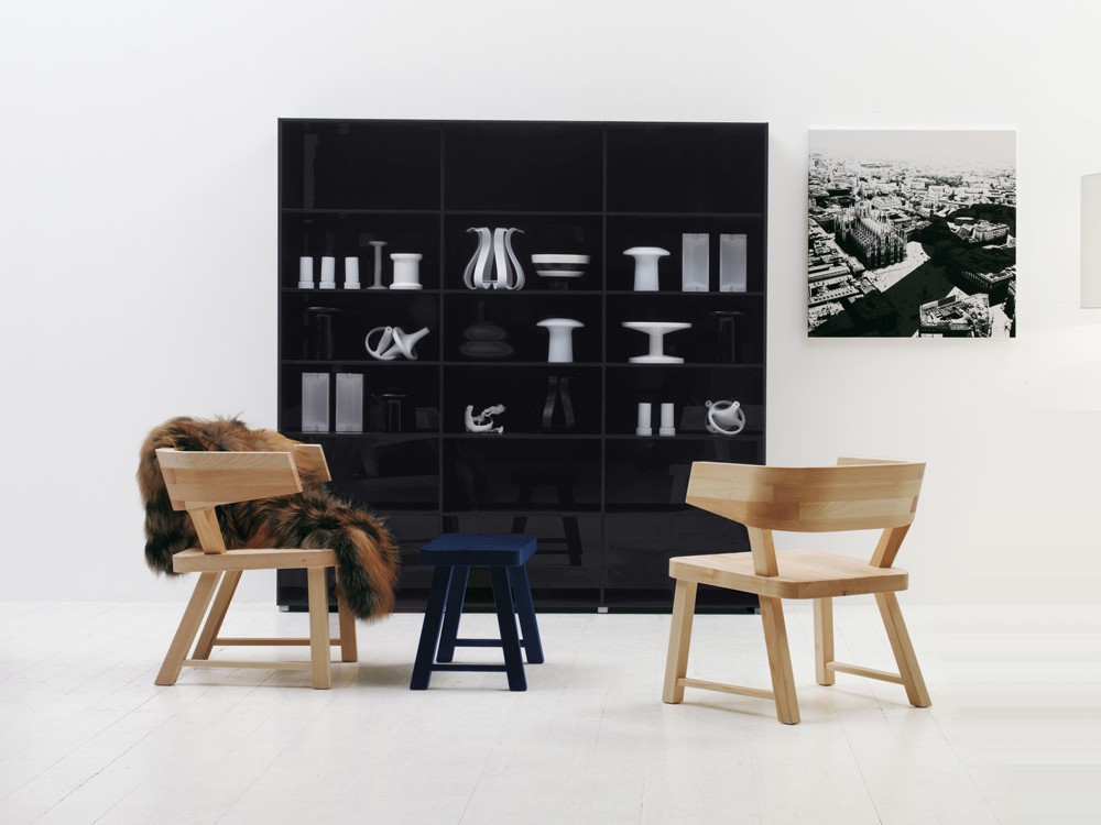 Simple, joyful forms, like the furniture in a doll's house, made from natural or blue-tinted sold lime with intricately crafted joints. The back support of the chair is a single curved element and the sanded finish amplifies the wood grain.