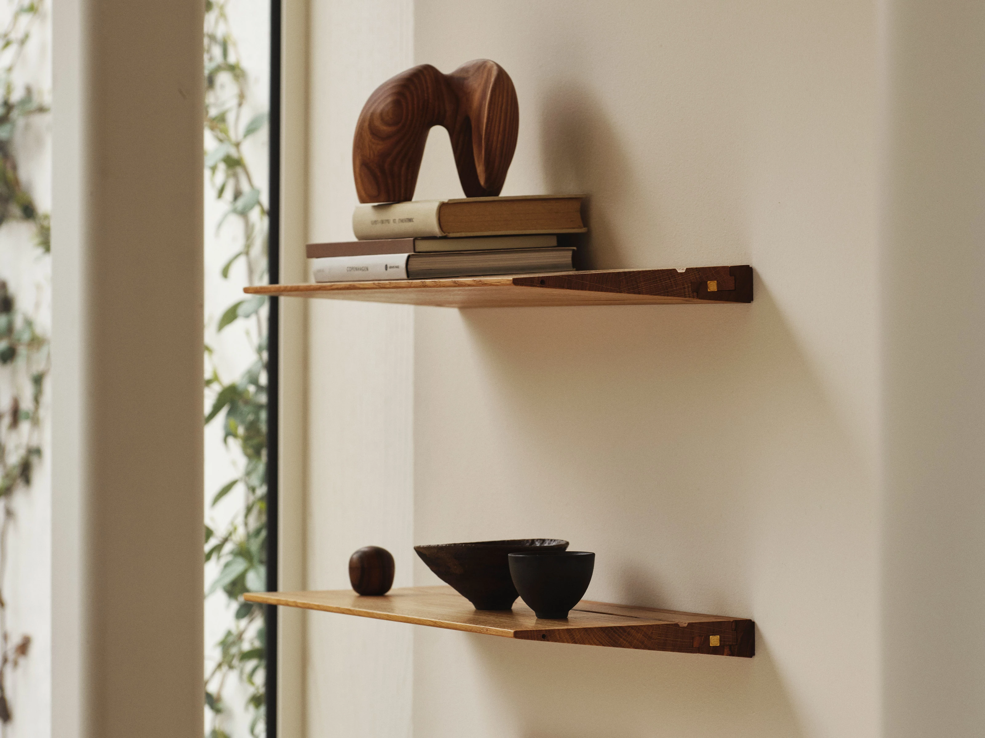 Japanese Sashimono is a highly skilled craft that emphasises beauty, functionality and durability - its defining detail lies in interlocking wooden joints that hold furniture frames together, without the use of nails or screws. The Tsugi Shelf draws inspiration from these traditional techniques, featuring refined joints between solid teak and oak elements that are secured with an elegant brass peg.