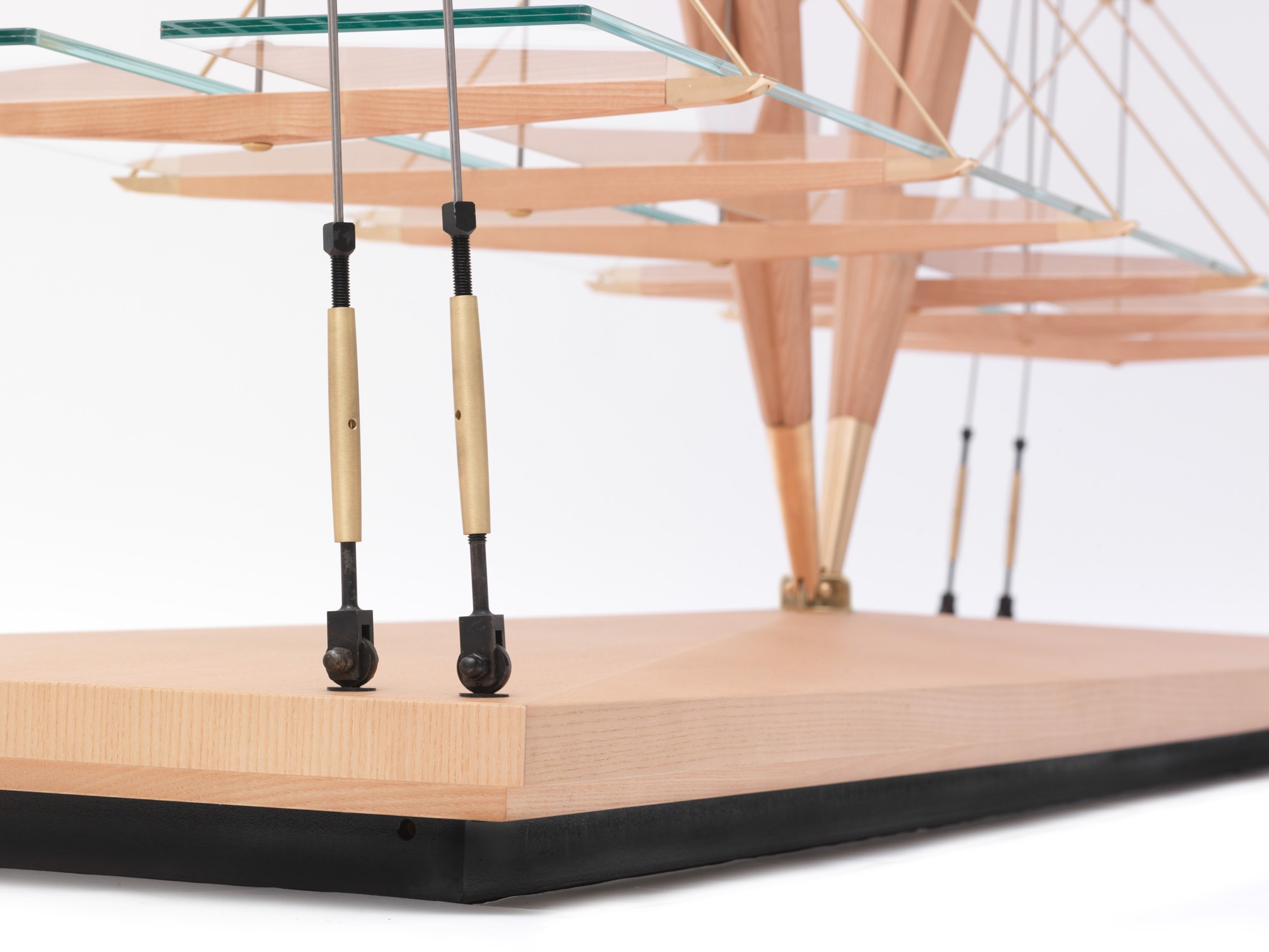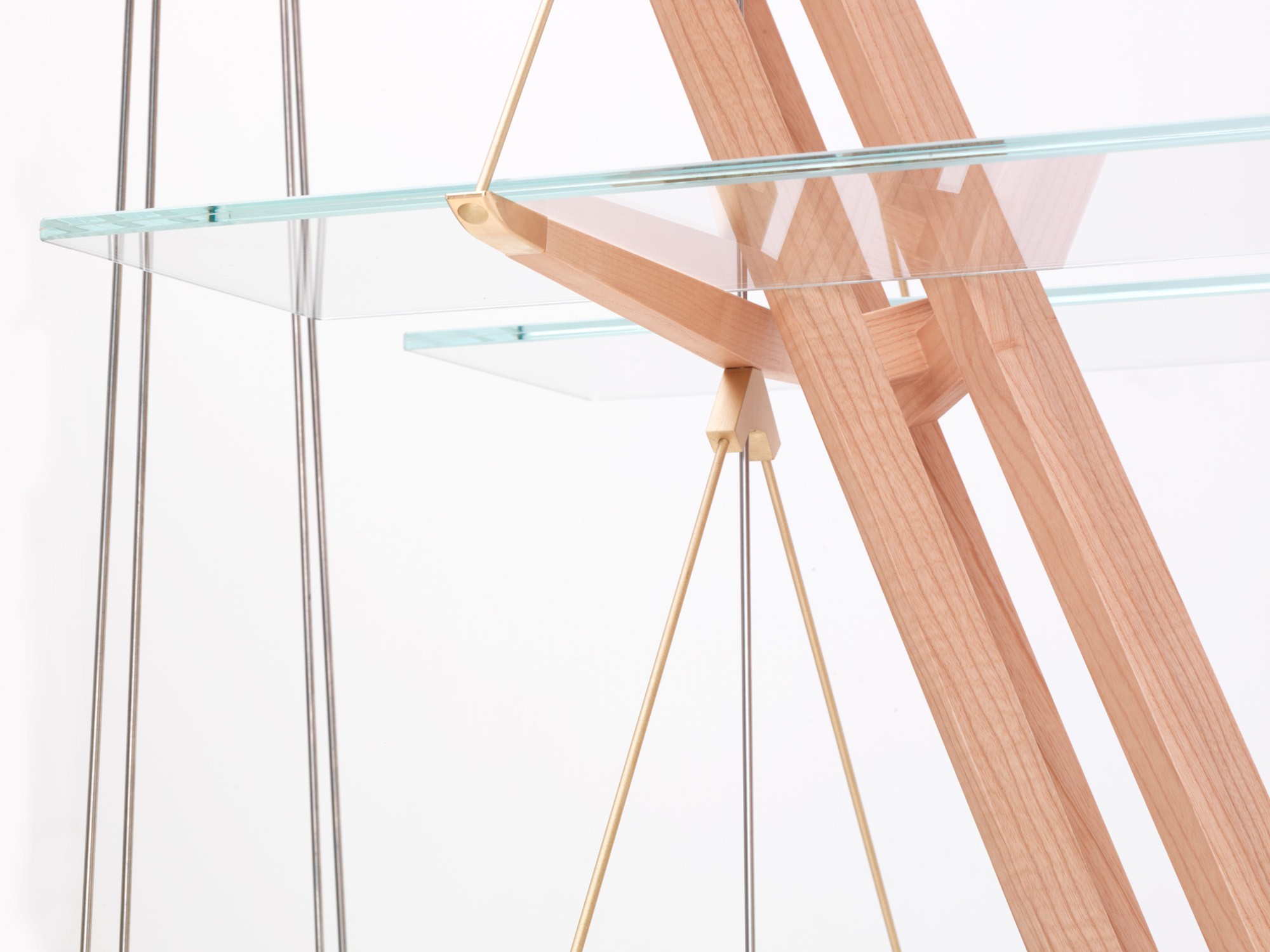 In its form and structure, “Veliero” recalls the masts and rigging of a sailing ship; two ash-wood beams fromwhich layered glass shelves are suspended with a system of steel ties. The result is airy, translucent andrigorous: books seem to literally float in space.