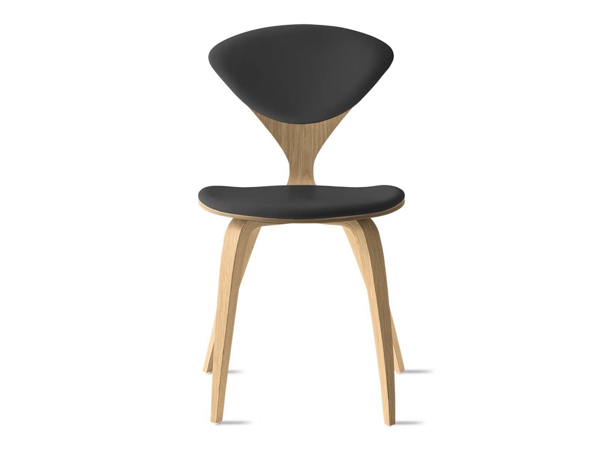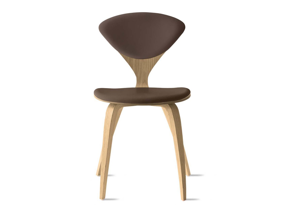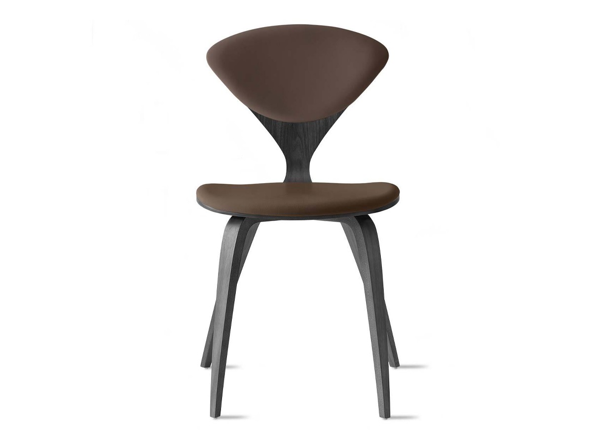 Boasting a perfectly curved frame with tapered legs, the Cherner Side Chair Fully Upholstered - Leather expertly embodies Norman Cherner's initial drawings. Originally designed in 1958, the simplistic yet sculptural piece applies plywood moulding technology to achieve the famous silhouette. Alongside the smooth oak veneer frame finish, luxurious leather upholstery showcases the iconic design while incorporating an extra level of comfort. The Camo Sierra Leather upholstery offers high durability, while its artful placement retains the stylish aesthetic and highlights the defining 'wasp waist' back of the chair.