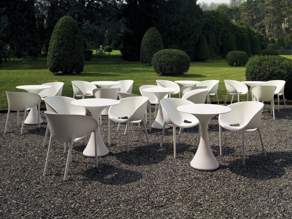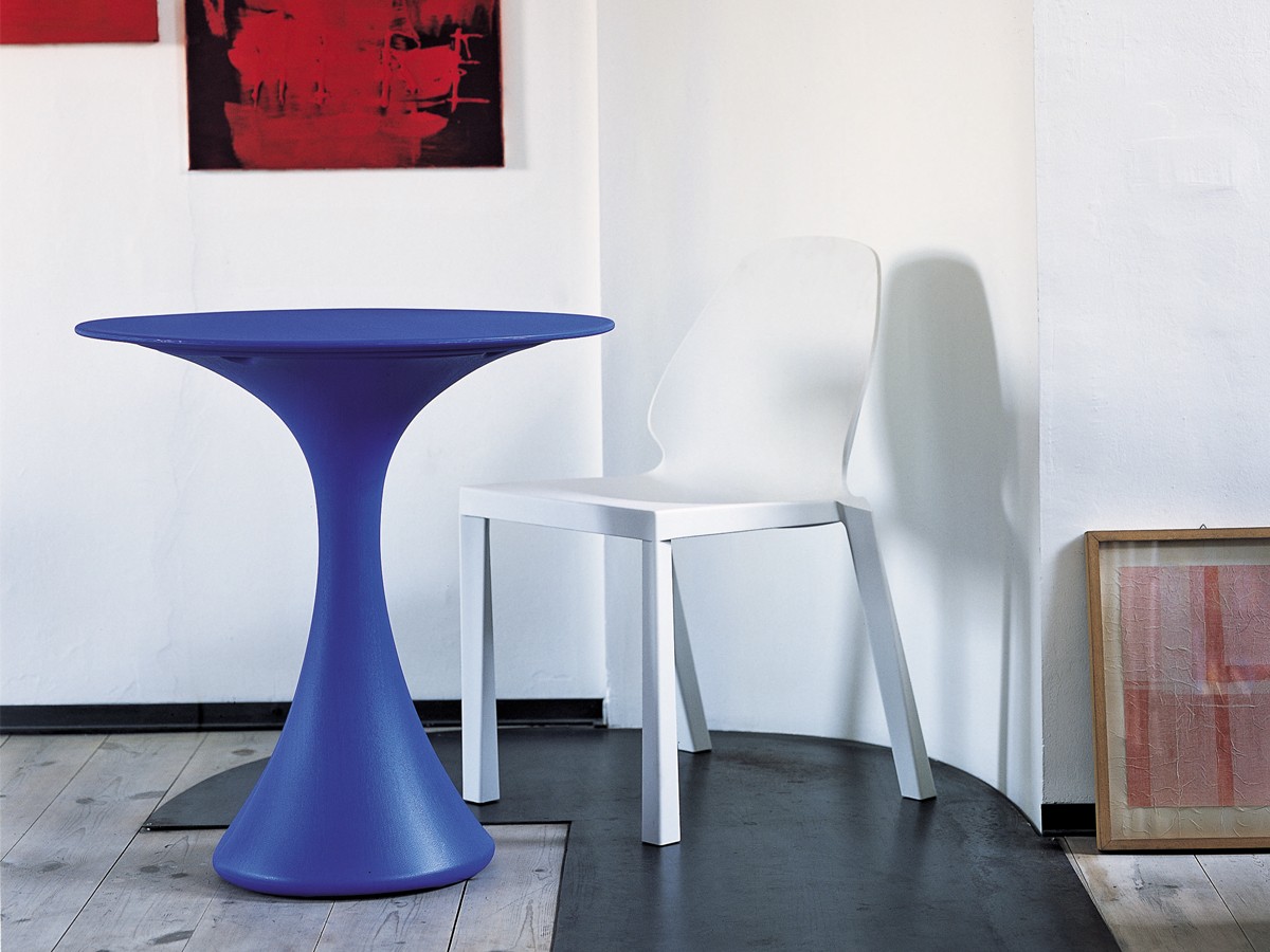 The contemporary Kissi Kissi table was designed by Miki Astori for Driade. It is available in white, red, anthracite black and blue.