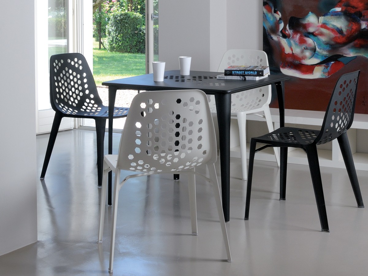The Pattern collection consists of a family of chairs and tables made from single metal sheets, all featuring the typical hexagonal decoration. They are extremely robust in spite of their light weight, and are practically indestructible regardless of the weather.