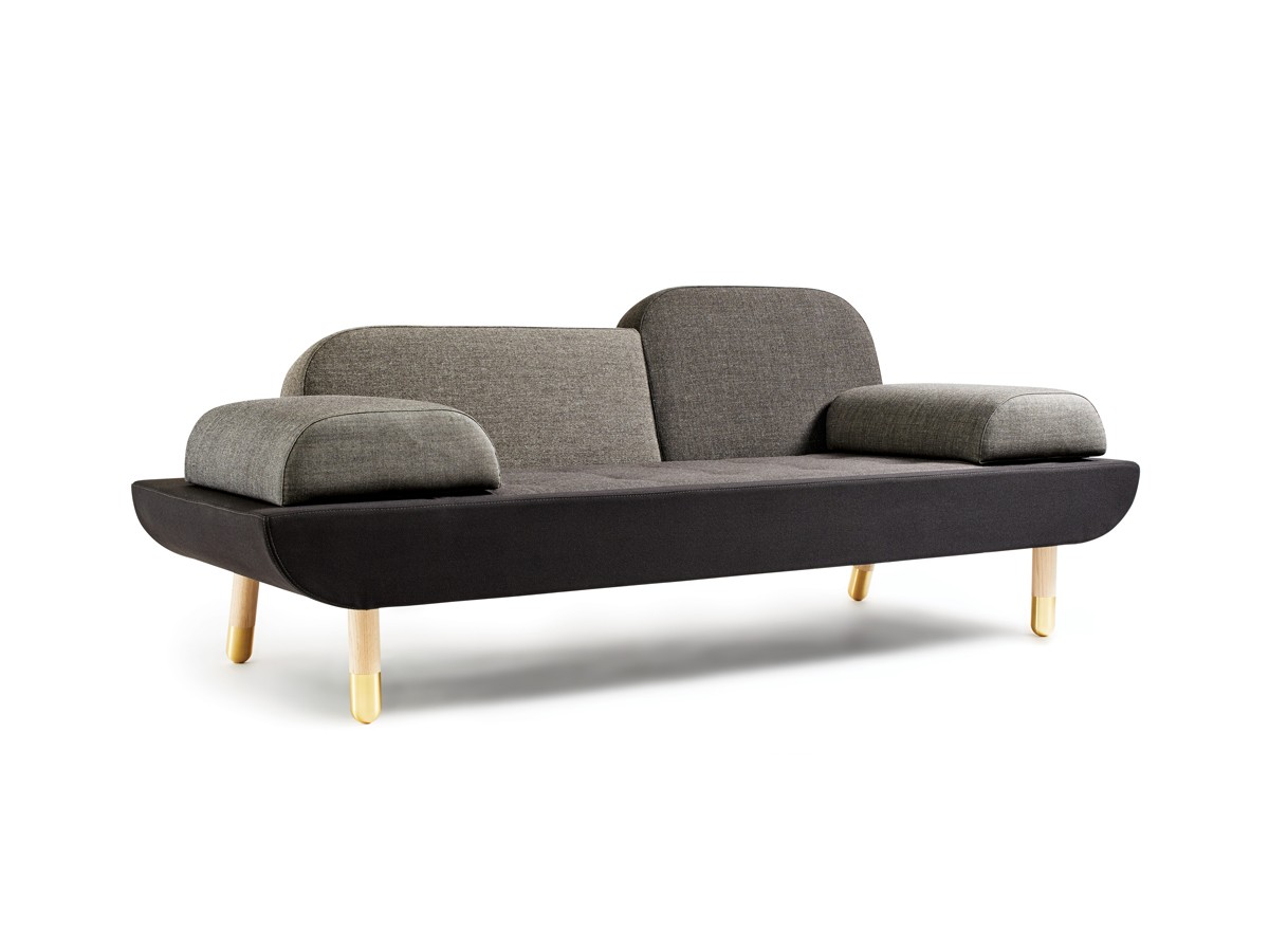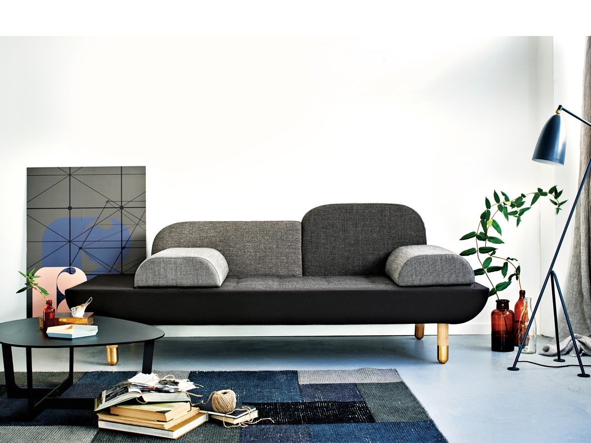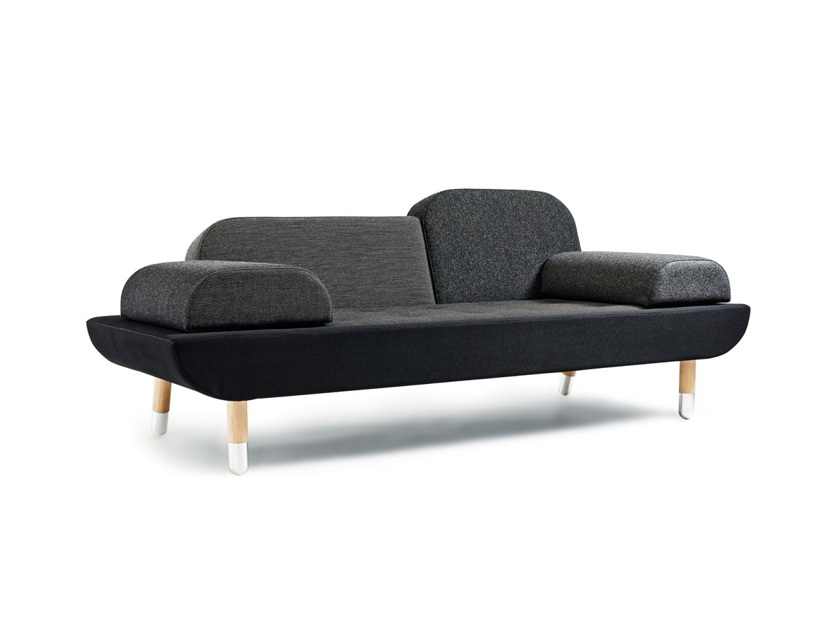 A comfortable sofa that allows you to lounge in multiple ways, the design is a base with a mattress and two back rests in different sizes. The two loose and interchangeable cushions further opens up for a versatile appearance and function.
