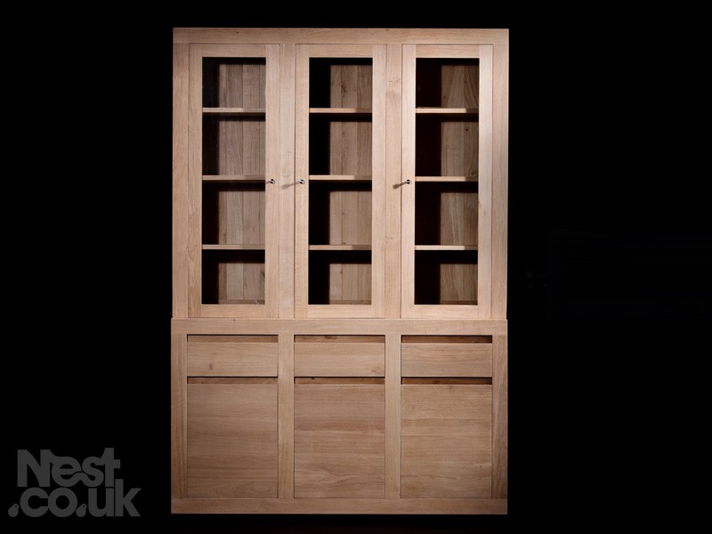 The regular sized dresser has 3 opening doors at the top of the dresser and 3 opening drawers at the bottom of the dresser. There are also 3 drawers in the middle of the dresser. The top doors are glazed.