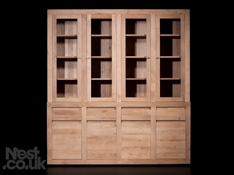 The large dresser has 4 opening doors at the top of the dresser and 4 opening drawers at the bottom of the dresser. There are also 4 drawers in the middle of the dresser. The top doors are glazed.