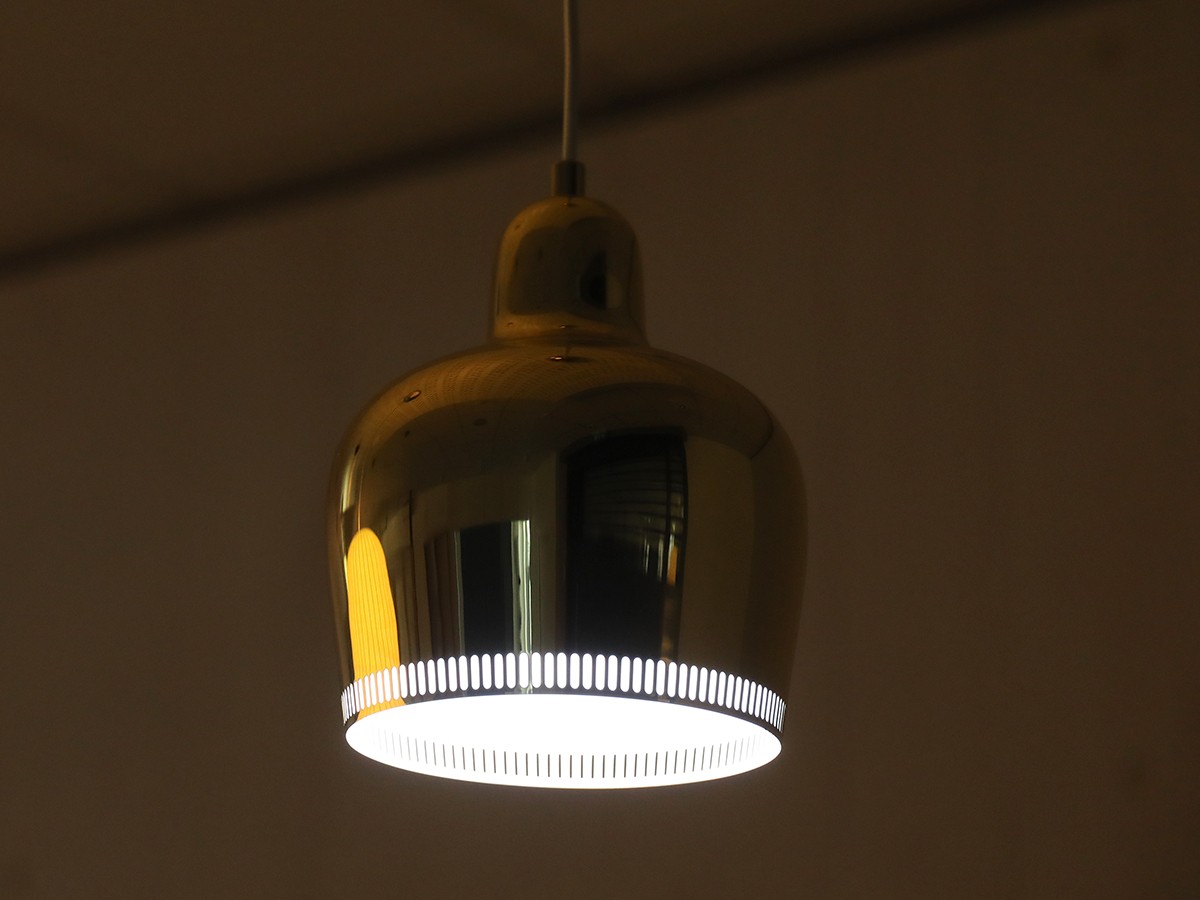 Made from a single piece of brass, the elegant Golden Bell was commissioned for Helsinki's famous Savoy Restaurant. An elegant, timeless luminaire, the lights metal shade is perforated around the edge, allowing a soft glow not only downwards but also to the side, creating a warming, enticing glow whether used over a dining table, in a hallway or in the living room.