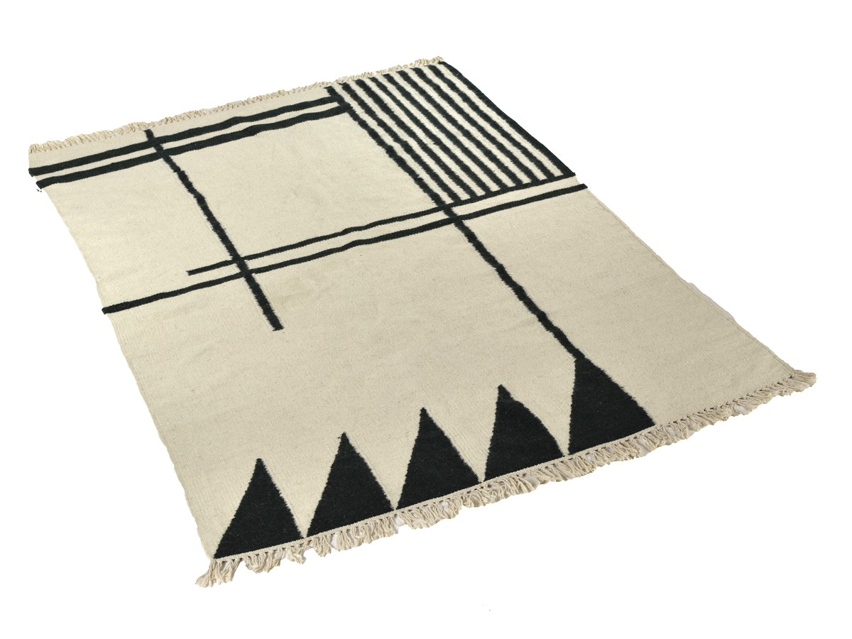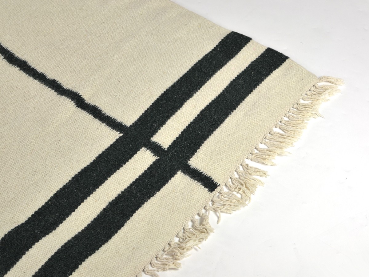 The Kelim Rug Black Lines from Ferm Living is a versatile design with a dynamic graphic print. The Kelim rugs are handmade using the traditional weaving technique, the 'Punja' loom. This is a traditional manual loom and one of the oldest weaving techniques. The wool yarn is hand dyed.