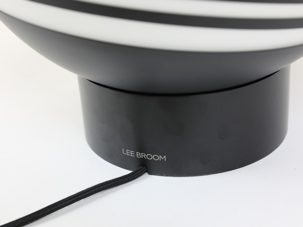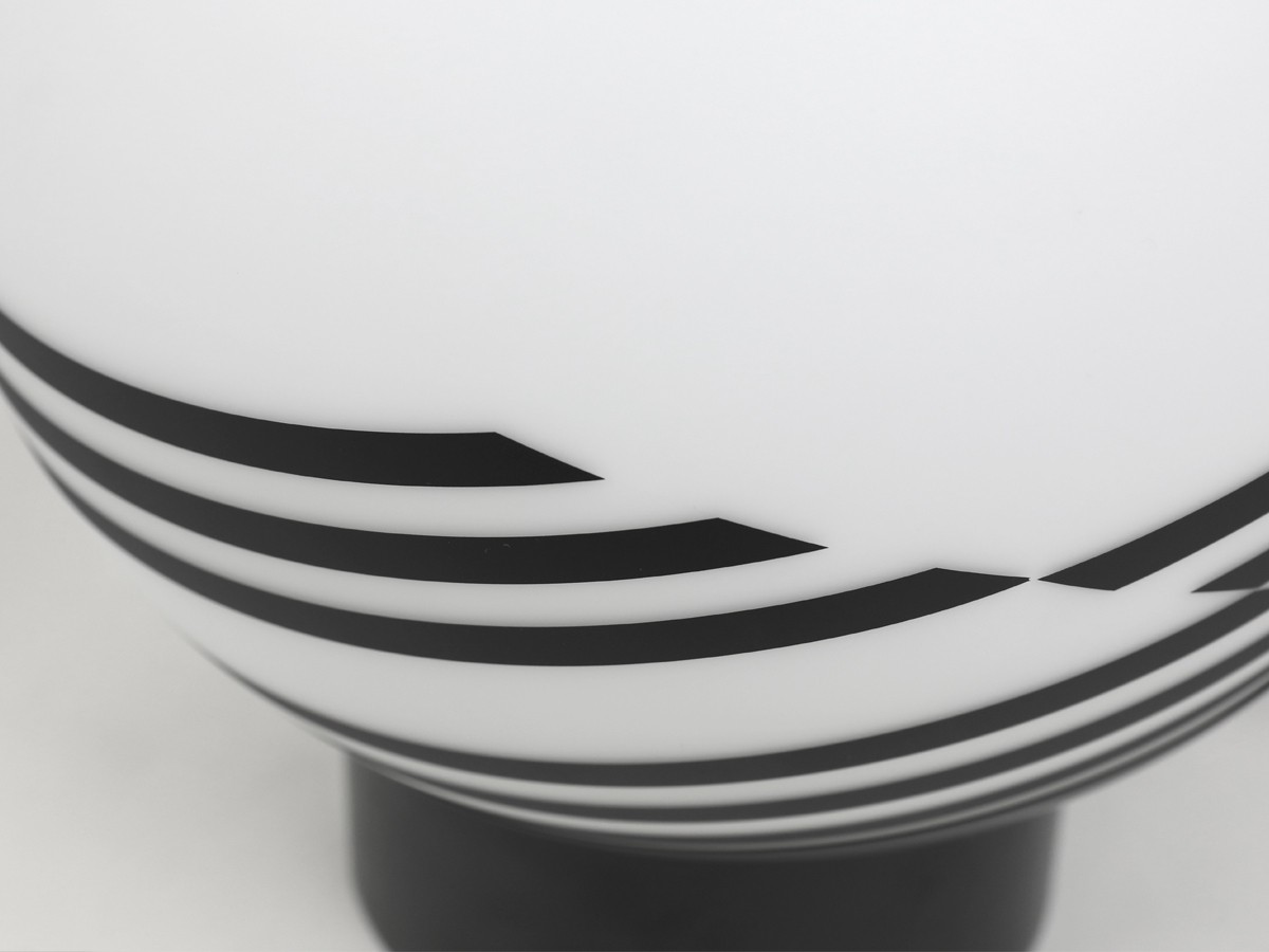 Op Art graphic patterns are the inspiration for this modern Optical table lamp designed by Lee Broom. Made from powder coated spun steel and blown opaque glass, the asymmetry of the black stripes are in contrast to the classic shape of the globe. When viewed from different sides, Optical's liner pattern changes. Optical's globe sits elegantly on a circular spun ring.