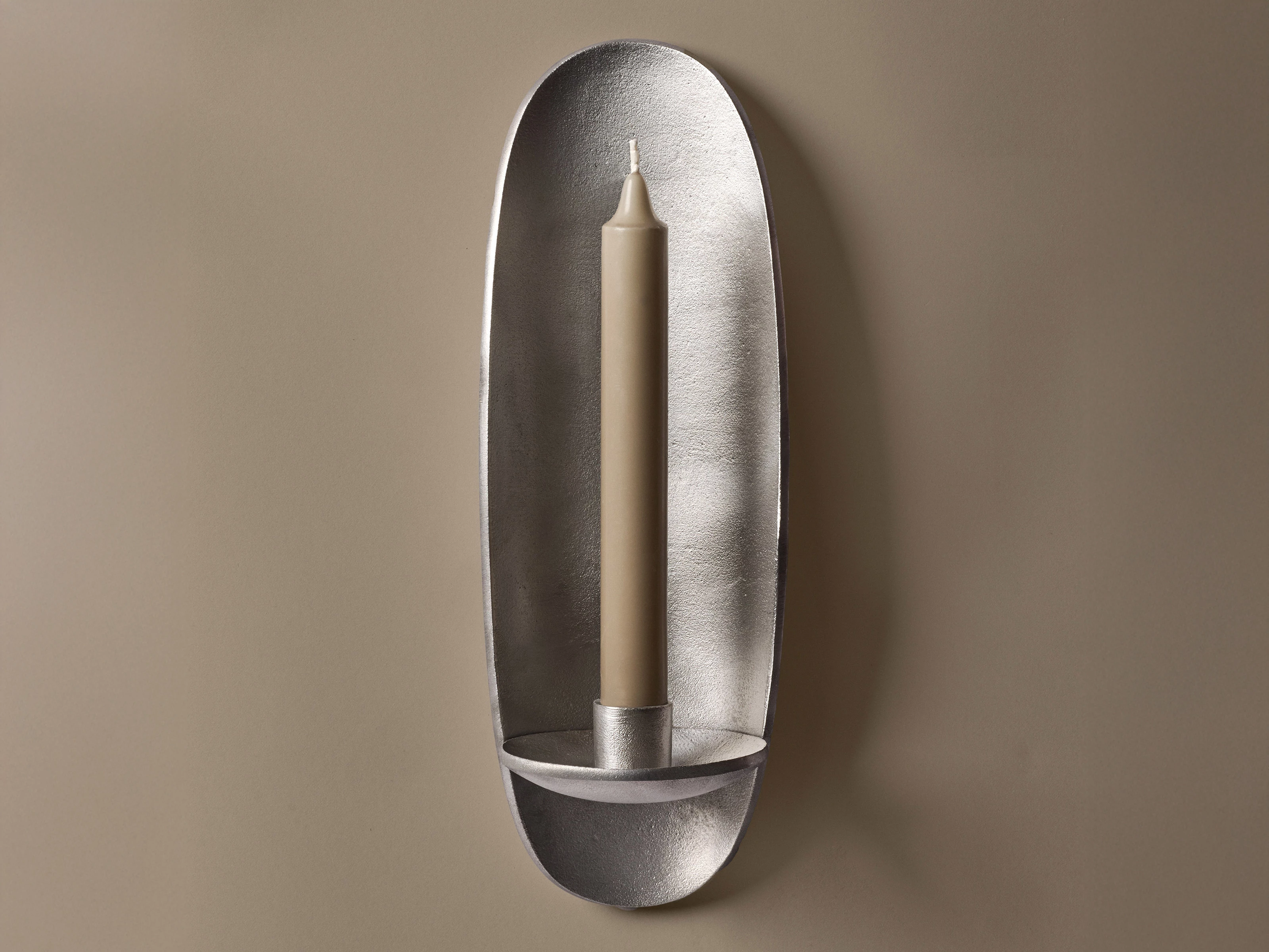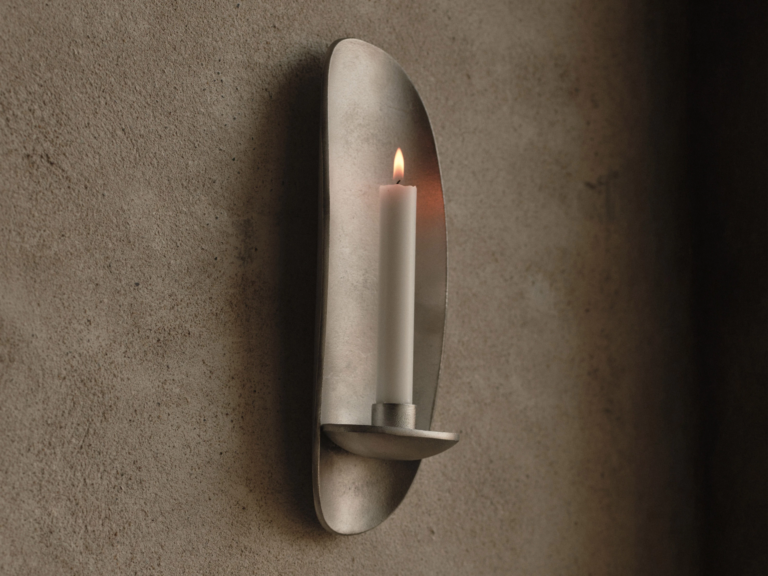 Crafted from recycled cast aluminium and displaying a rustic, textured surface, the Agapé Wall Candle Holder captures a raw yet refined aesthetic. Designed to hold a 2.2 cm taper candle, this wall-mounted piece blends functionality with an aura of serenity and grace - a modern expression of quiet reverence through form and the soft glow of firelight.