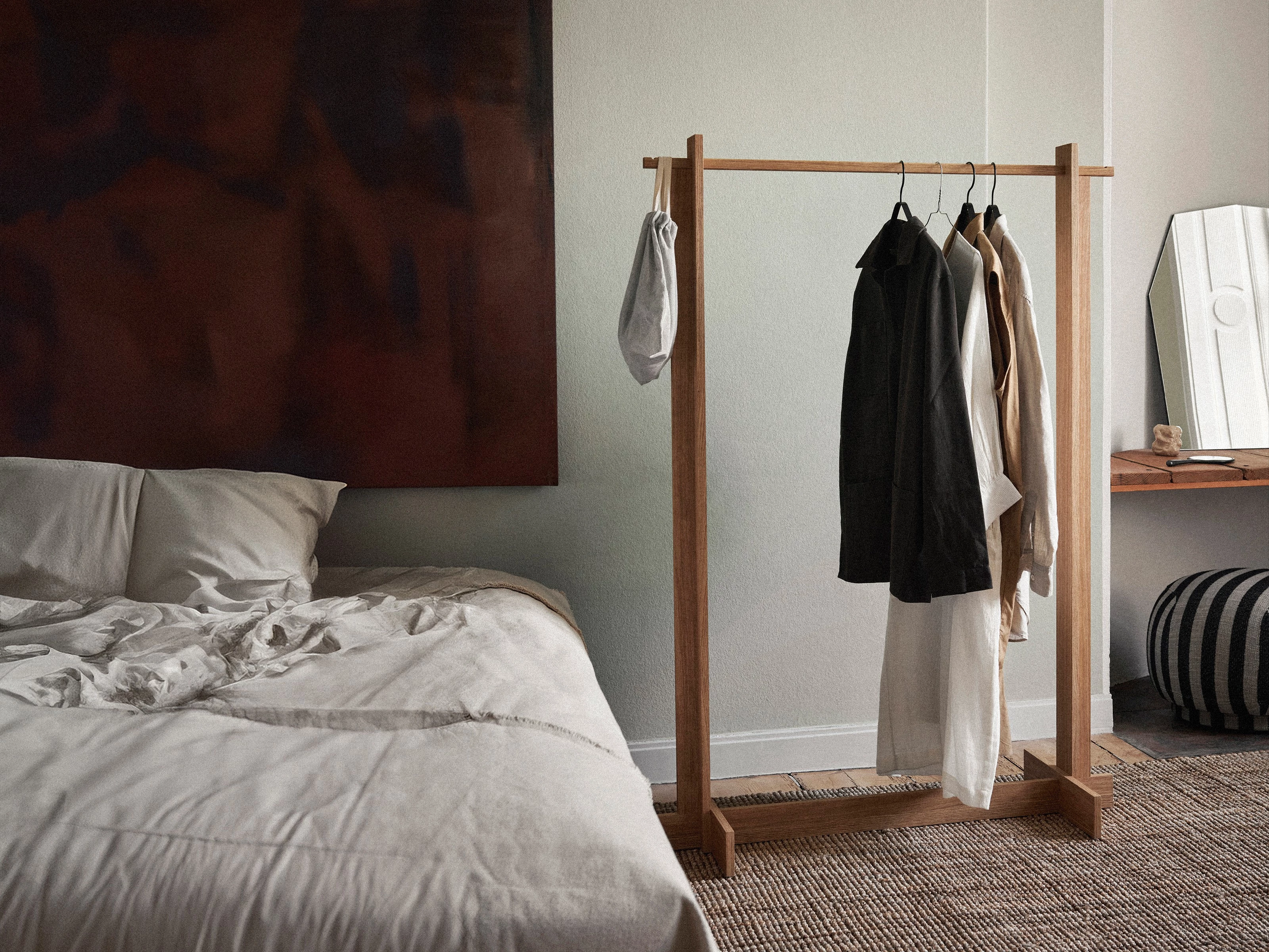 Featuring meticulously crafted joints cut by the expert artisans at Ferm Living, the Bridge Clothes Rack has a distinctly architectural flair. The simple silhouette defines the shape of the structure, a functional and elegant storage solution suitable for coats, jackets, and other items of clothing both large and small. The rack is both durable and richly tactile, constructed from beautiful oak-veneered MDF.