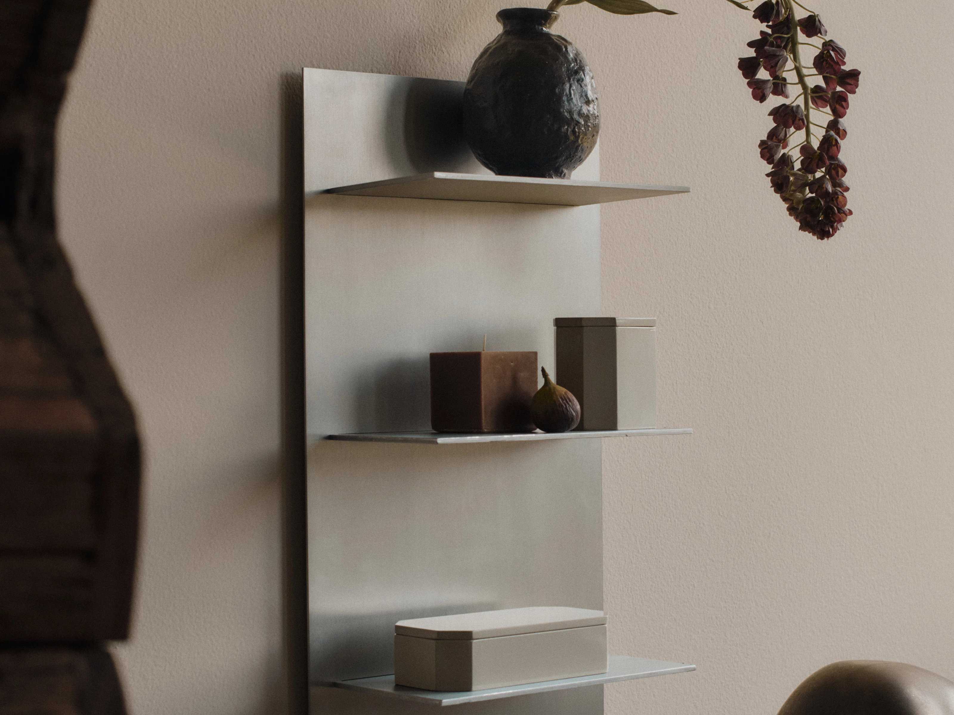 Influenced by the raw clarity of industrial and brutalist design, this small Lager Wall Shelf explores structure, repetition and proportion. Brushed aluminium gives the piece a sleek, refined edge, while its triple vertical composition introduces a rhythmic, architectural presence that feels purposeful and precise.