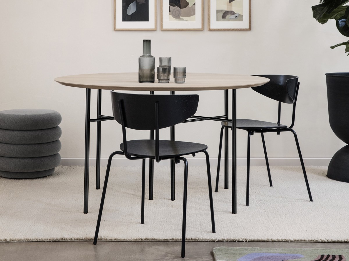 An inviting piece of contemporary design, the perfectly balanced proportions of the Ferm Living Mingle Table Round mean it can be used as either a dining table or a desk - the choice is up to you. The round table top is made from oak veneer, in a pale, natural tone which contrasts perfectly with metal trestle legs. Crafted from powder coated metal, these pared back trestles add a sculptural quality to the Mingle Table whilst also providing a sturdy base for the round table top.