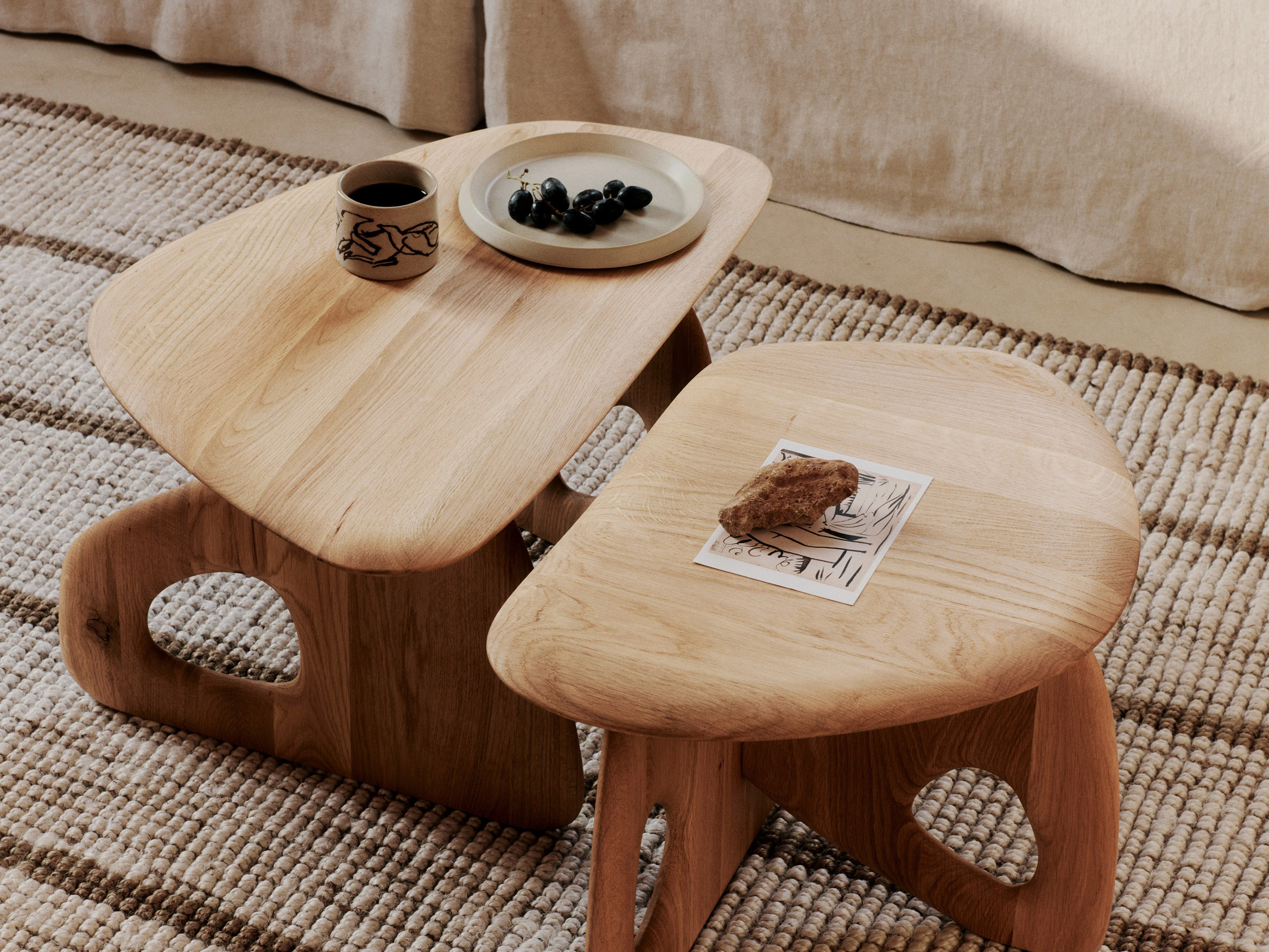 The Oar Coffee Table blends sculptural elegance with practical refinement. Its fluid, oar-like curves and distinctive leg cut-outs create a visual rhythm, while the natural grain of the FSC™-certified oak and brass feet lend warmth and subtle sophistication.