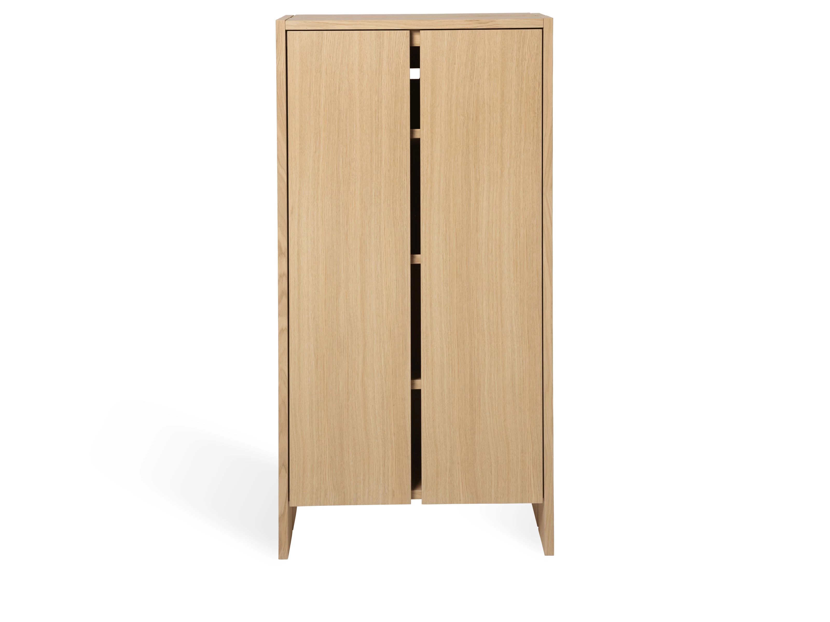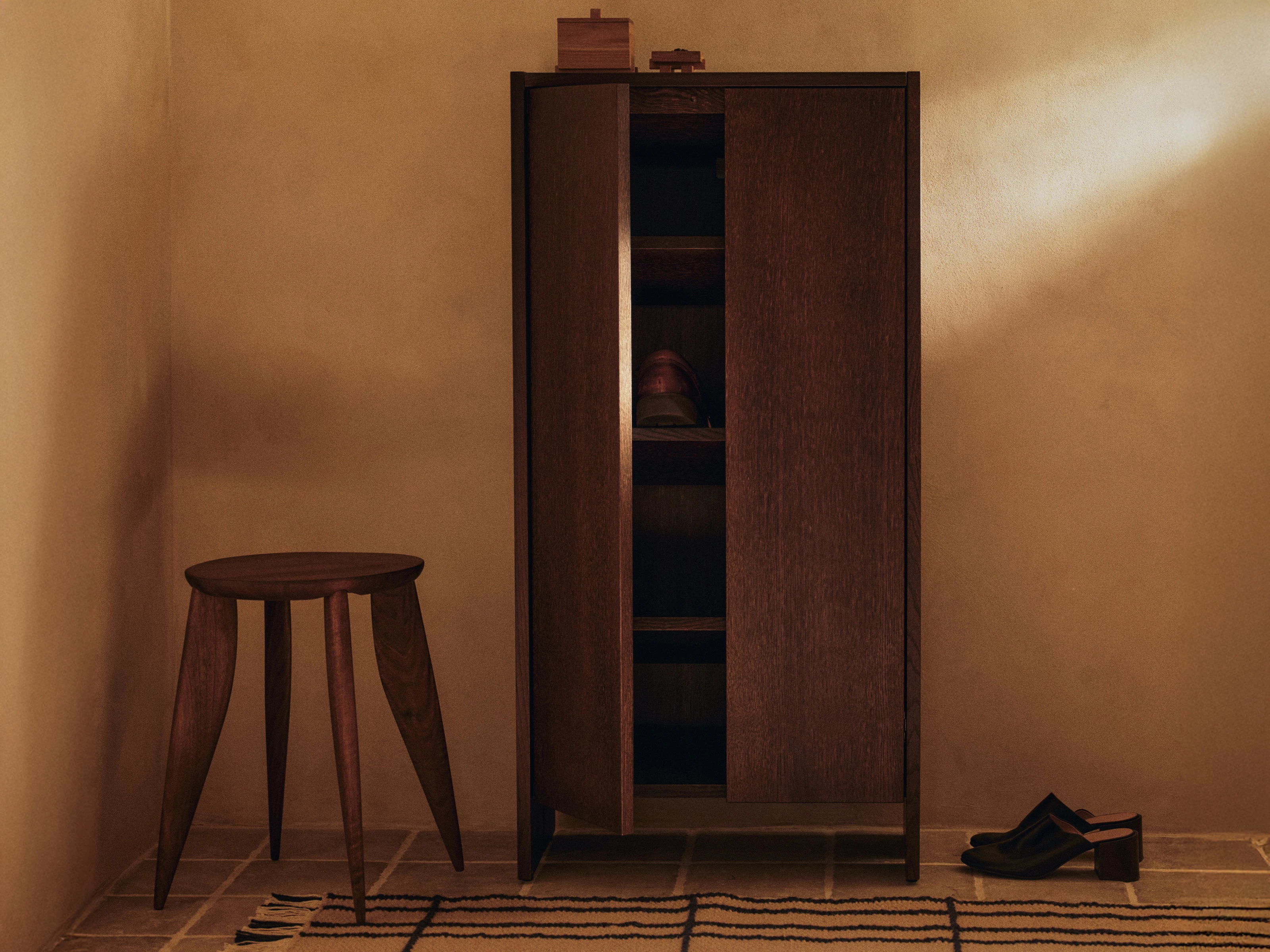 Made from FSC™ Mix-certified oak veneer, it mounts neatly to the wall, with hinged shelves that can be angled for shoe storage, if desired, and a discreet upper compartment for keys and essentials. In your hallway or apartment, the Parcel Cabinet restores calm, keeping daily necessities organised with refined simplicity.