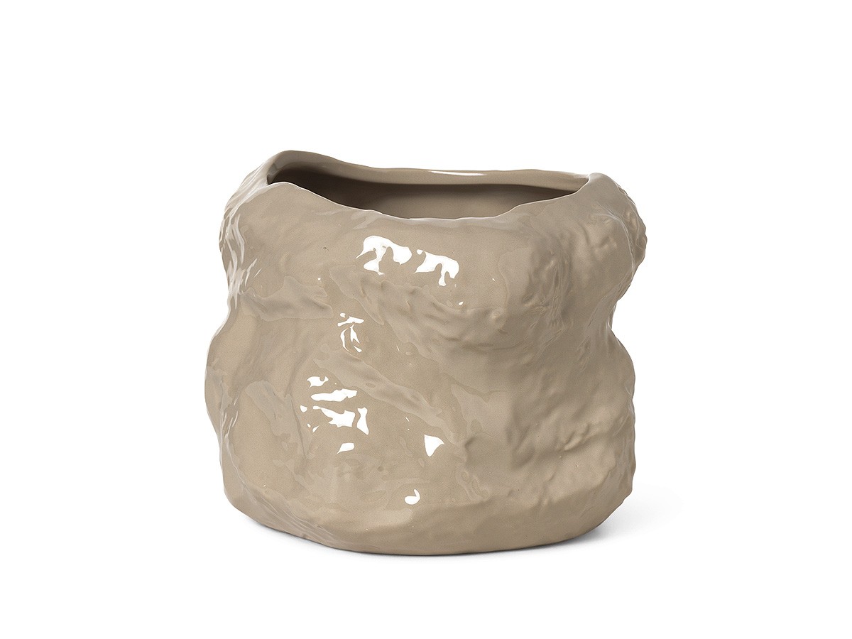 The Ferm Living Tuck Pot is a sculptural piece of art as well as a versatile vessel for housing flowers, plants or small accessories. Its striking profile embodies a natural, organic shape, with a layered high-shine glaze in a creamy cashmere colour allowing for a light-reflecting finish that highlights its furrowed surface. Ideally utilised upon a sideboard, table or window ledge, this artistic creation adds a distinctive, characterful expression to a room by bringing the beauty of the natural world into your home.