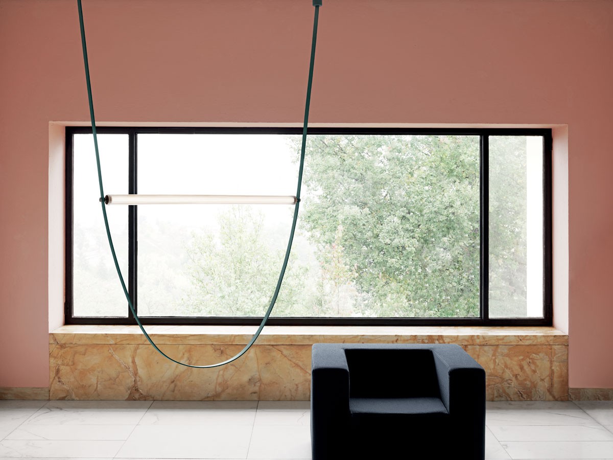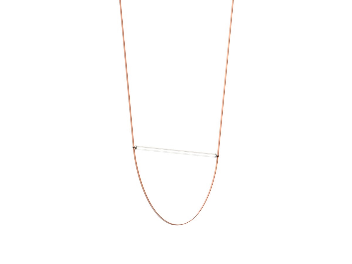 Blurring the lines between artistic expression and industrial design, the Wireline suspension light has a combination of beautiful qualities. A juxtaposition of shape and colour, Wireline can be installed solely or as part of an elaborate artistic arrangement. Hung in a hammock-like formation, the cable delicately grips a fluted glass tube that houses the light source, easily adjusted to the user's desired length. Based upon a conceptual idea where functionality meets the unexpected, Wireline is not only a practical lighting solution but an elegant focal point that can be hung in layers over an impressive staircase or grand entrance hall.