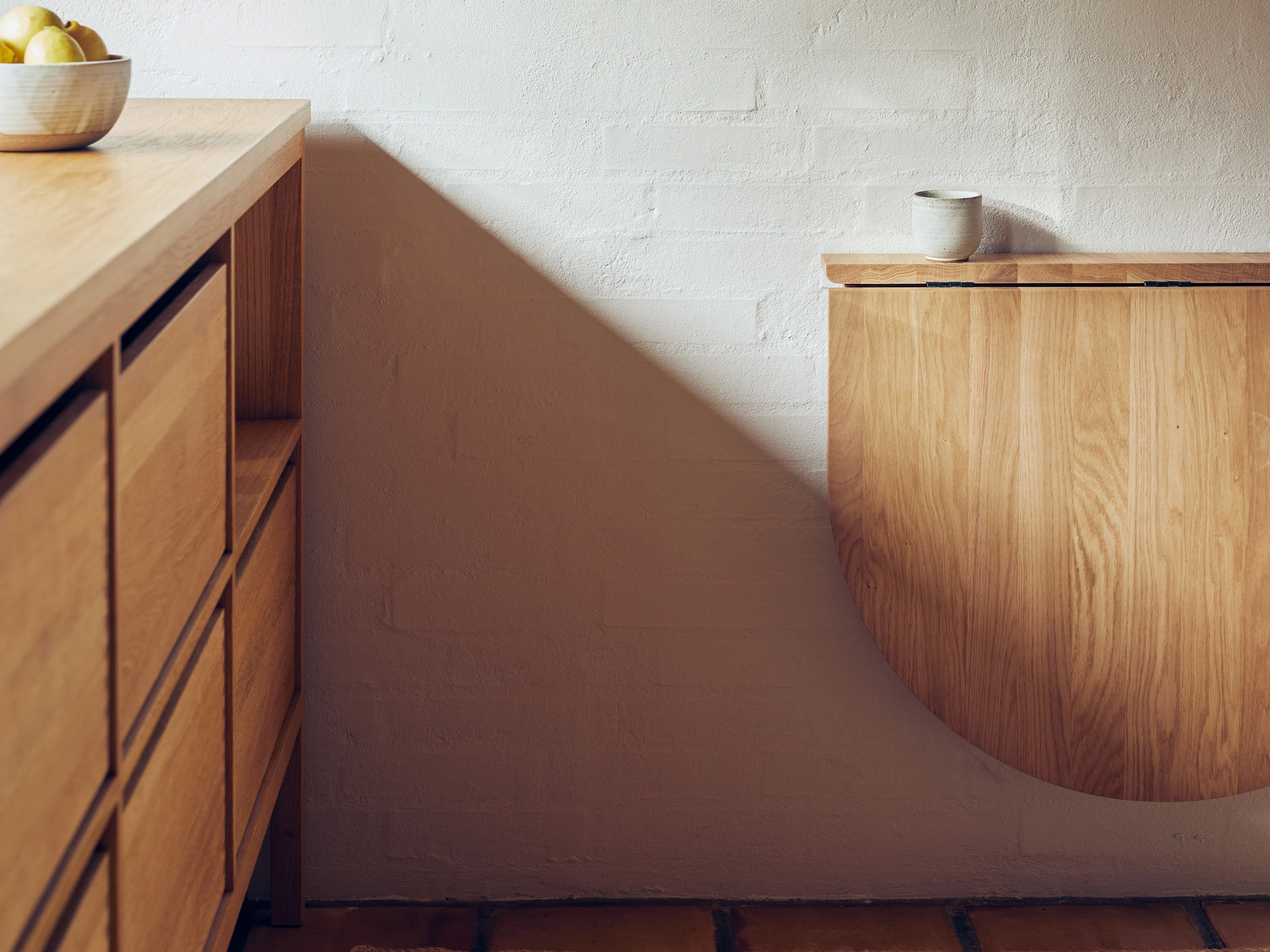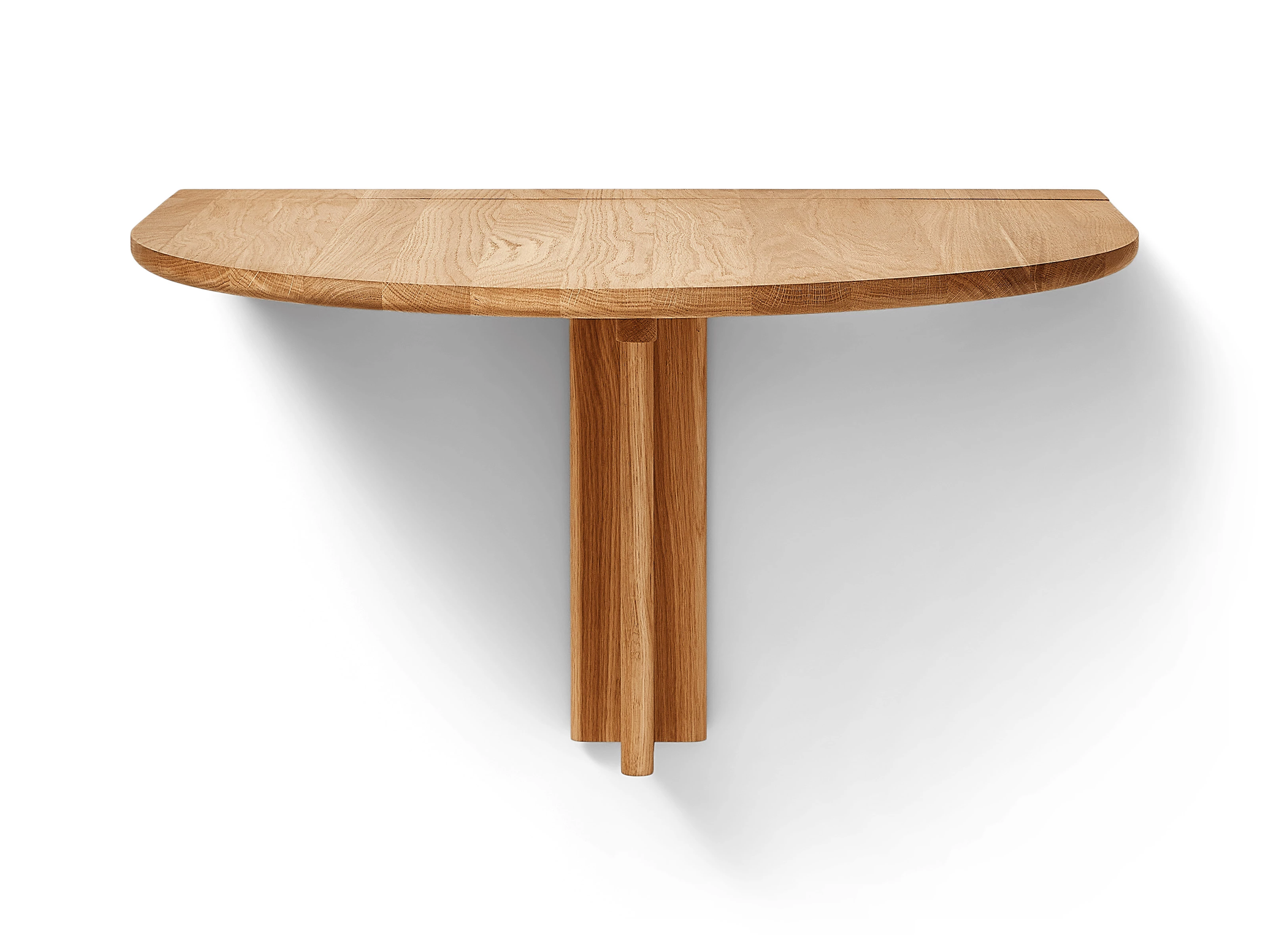 Inspired by the elegance of space-saving design, the Trefoil reimagines the classic drop-leaf table with a refined, architectural twist. Its slender oak frame, rounded edges and floating structure offer a modern, airy aesthetic as well as a warm, tactile presence on the wall.