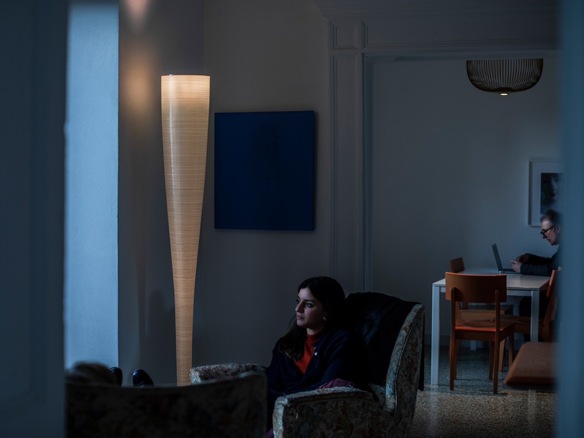 Mite features contemporary materials, a mix of fiberglass and carbon thread or Kevlar®, which acts both as ornament and supporting structure. The technology behind this project is the same as used in golf club manufacture, but Foscarini was the first to use it in the lighting field.