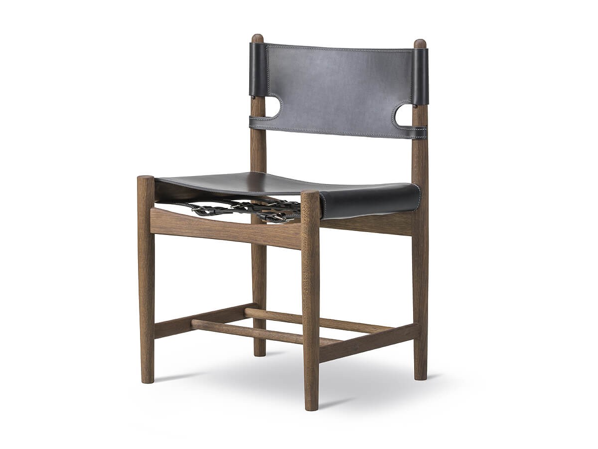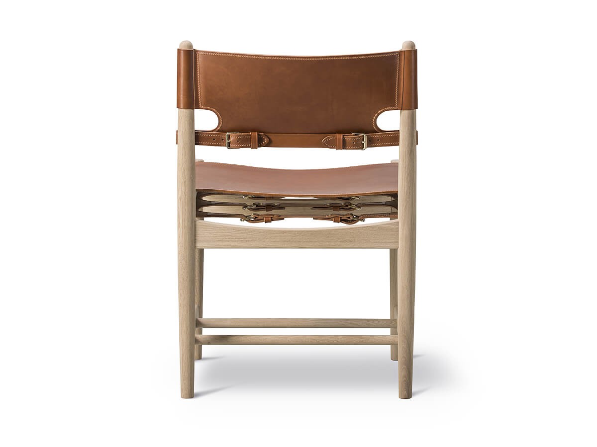 Expertly crafted from the finest selection of oak and flawless saddle leather, the Spanish Dining Chair pays homage to the use and beauty of natural materials in deisgn. Available in Cognac or Black leather with a Soaped or Smoked Oak frame, the chair's 'hunting lodge' aesthetic can easily stand out or blend in, depending on your chosen interior style. Both hardwearing and stunning to look at, the chair boasts an honest, organic design; with its warming tones and simple profile forming a timeless piece that is a beautiful addition to a dining room space. The Fredericia Spanish Dining Chair is also available with armrests and as a lounge chair.