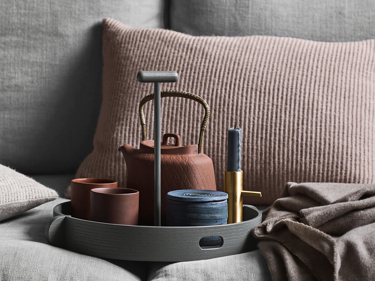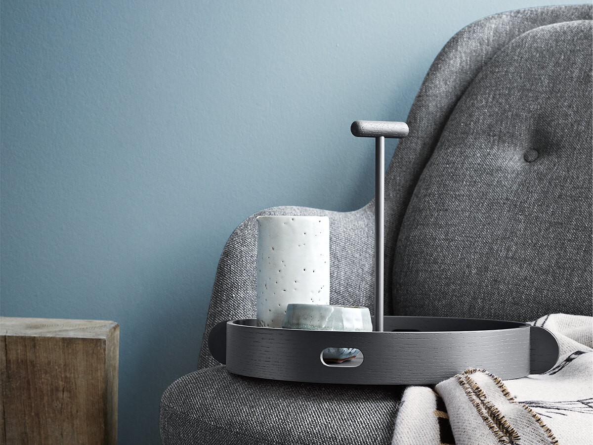 Defined by a circular base with a functional high handle that allows for ease of movement, the tray is perfect for transporting food and drinks from room to room, or for holding a collection of decorative accessories such as candles and petite vases. Finished in a contemporary grey, the tray can coordinate with an array of living spaces, providing a simple yet sculptural surface area to hold personal belongings and household items.