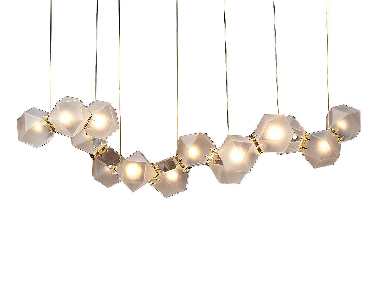 Elegantly floating above the room in which it inhabits, a fixture of striking proportion balancing geometric shape and soft white alabaster frosted glass, the Welles Glass Long Chandelier is a beautifully sculptured mould-blown masterpiece, delicately clasped by polished metallic prongs. An intricate modular system, neatly interconnected through metallic fixtures, inspired by those found in fine jewellery, the chandelier creates an awe-inspiring optical illusion, exuding a cloud-like glow through line segmentation and polygonic shapes. A combination of sculptural innovation and metallic proportion, the Welles collection showcases Gabriel Scott's specialist attention to detail. Display the lighting fixture in an array of configurations; suspend horizontally, vertically or diametrically to create your desired arrangement, a delicate diffusion of light, emitting through metallic hollowed forms creates a visually breathtaking focal point, unique to a grand entrance hall or luxurious dining space. Also available as part of the signature Welles collection, the Welles Glass Wall Sconce and the Welles Double Blown Glass Pendant.