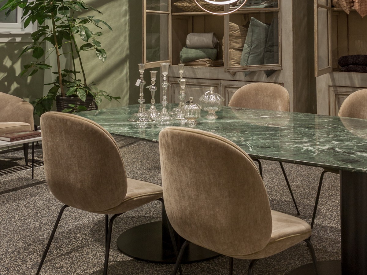 The design for the chair was found in the insect world, as GamFratesi took inspiration from the beauty of the anatomy and movement of a beetle. The chair reinterprets the curved characteristic elements of the beetle's unique shells, sutures, rigid outsides and soft insides. The chair is now available here in luxurious Gubi Velvet, bringing opulence and a touch of class to any space.