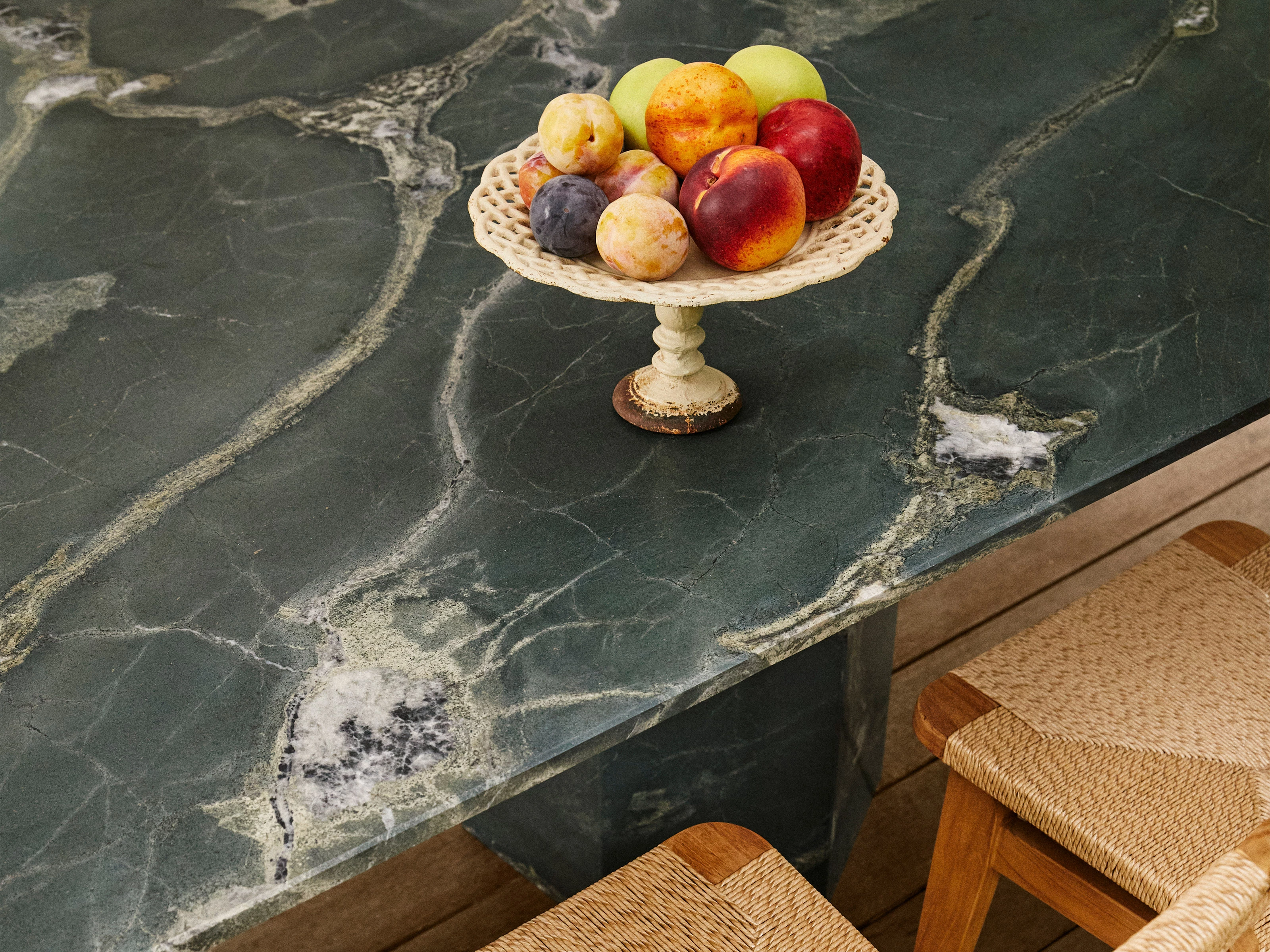 Equally suited to indoor or outdoor environments and comfortably accommodating eight diners, the table’s unique veining and natural marbling infuse any dining setting with a luxurious touch, while clusters of glistening quartz crystals make it even more spectacular. Whether placed at the heart of a garden, courtyard or terrace, the Epic Outdoor Dining Table is poised to become a captivating centrepiece with a lasting legacy.