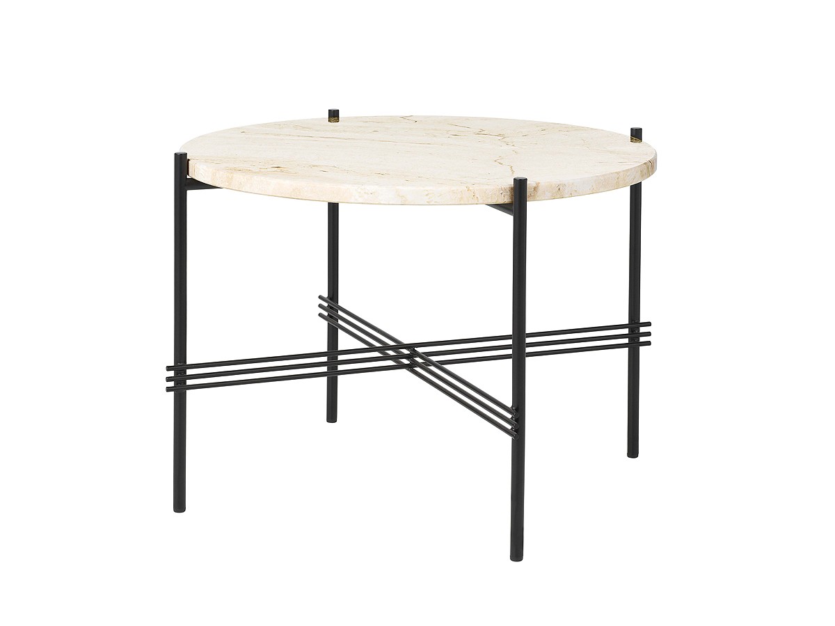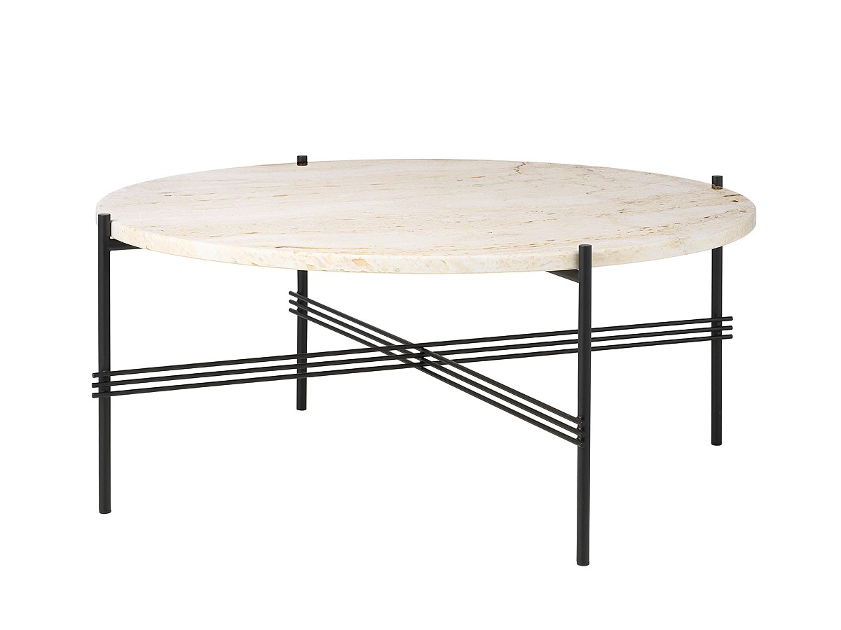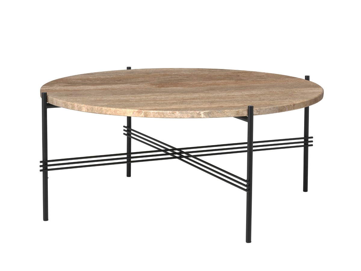 Originally designed for 'The Standard' restaurant in Copenhagen, the Gubi TS Travertine Coffee Table - Black Base embodies luxurious contemporary design. Expertly crafted from solid materials, it is characterised by its slender legs, beautifully crossing details and contrasting. elegant Travertine tabletop. Ideally utilised in a living room in front of a sofa or lounge chair, it is available in two sizes and adapts flawlessly to a range of interiors, supplementing style and elegance to your home.