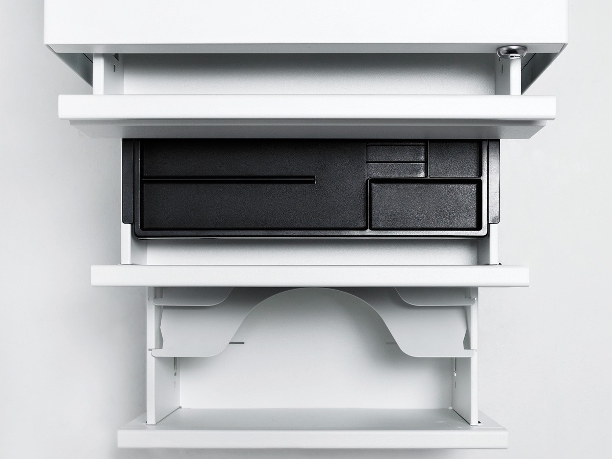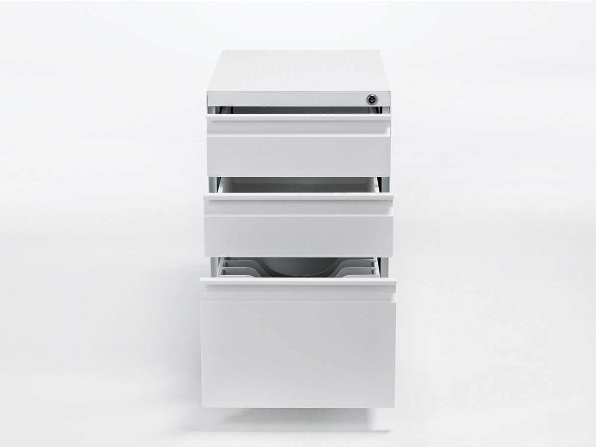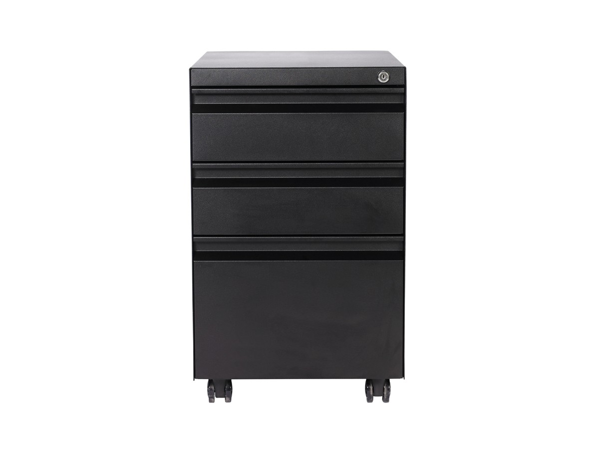 Ideal for use as a filing cabinet under a desk. It has three drawers and wheels and is available in either black or white.