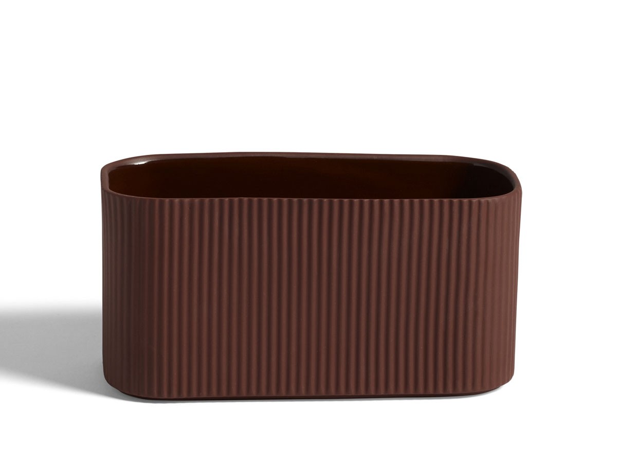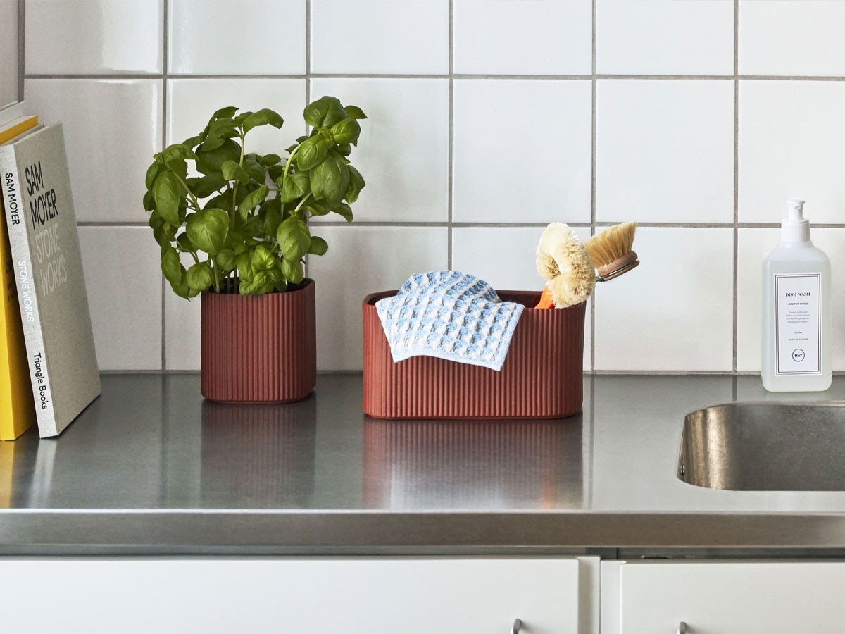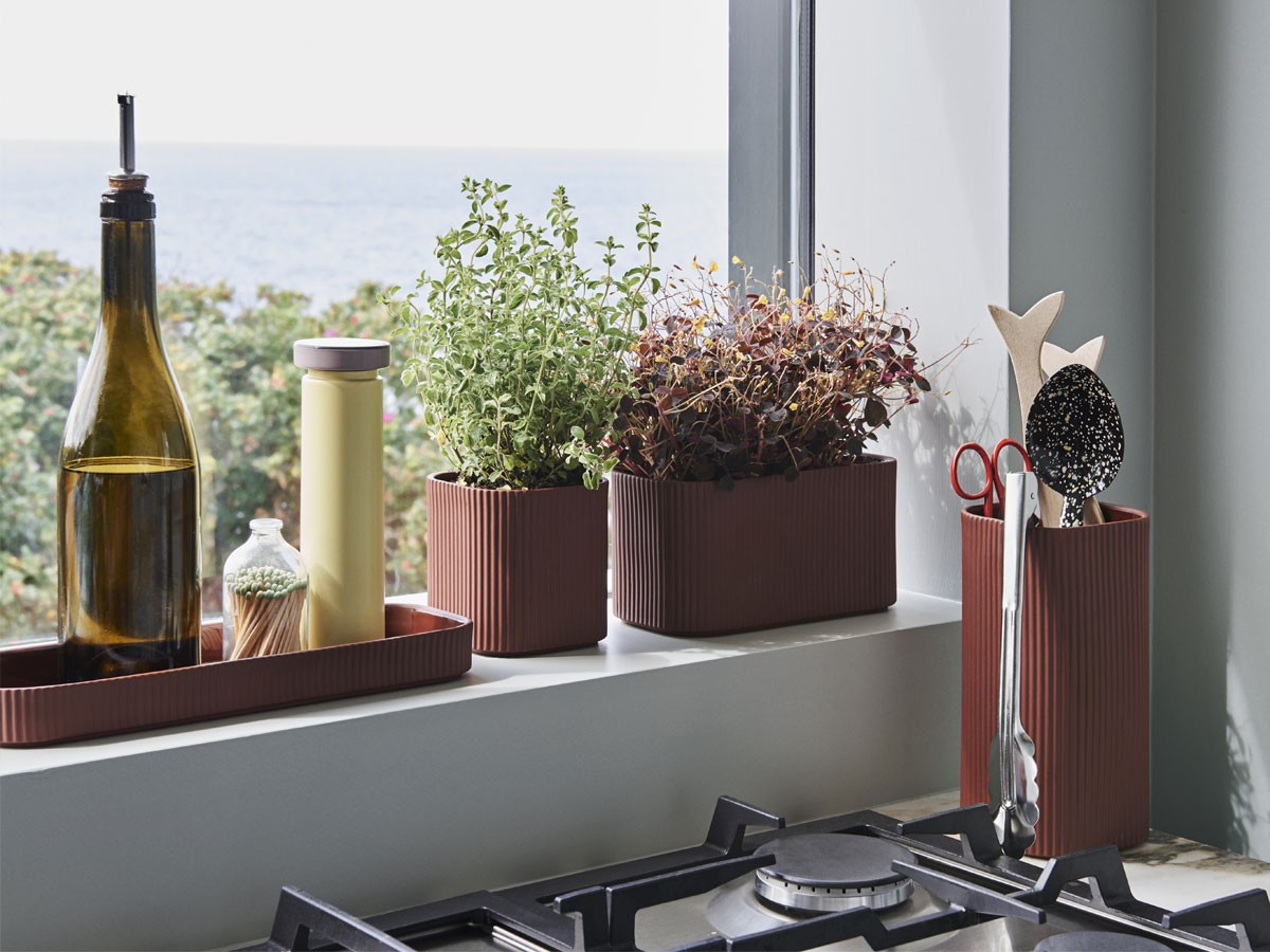 Part of the wider Facade series, separate Copenhagen-based design studios, Kilo and COBE have joined together to create a series of ceramic vases and plates, inspired by the materials and DNA of the COBE-designed building Forfatterhuset, a kindergarten with a unique brick cladding and green roof gardens. Defined by a tactile, linear structure of smooth ridges, the Herb Pot is a stylish, hard-wearing piece for you to grow your favourite herbs or to elegantly display small plant arrangements. A versatile piece, available in two sizes, the pot can also be used to store kitchen utensils or small accessories; with its organic, ceramic design a timeless, purposeful addition to the contemporary home.