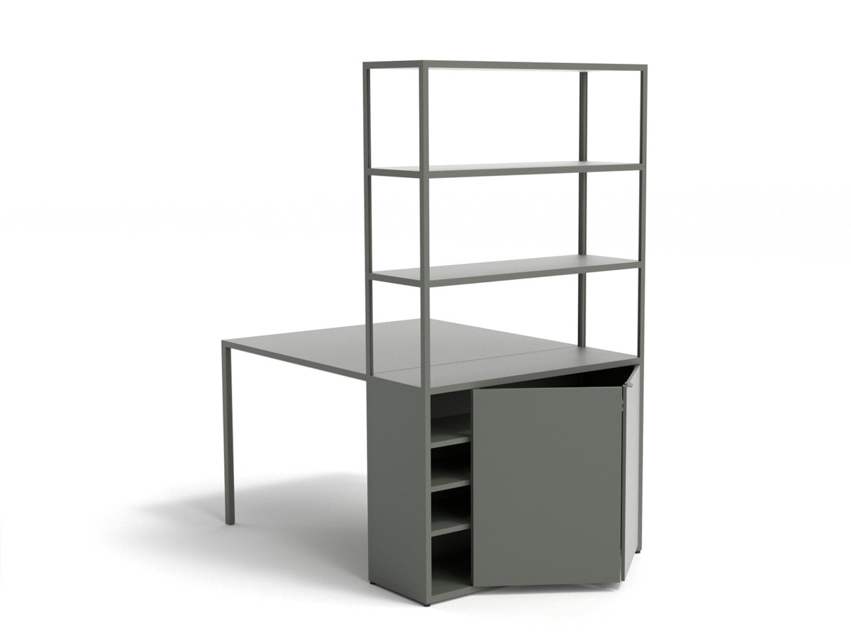 Comprising a table and a mix of open and closed shelving, the New Order Combination 401 creates a compact workstation with ample storage. Like most pieces from Diez’s modular New Order collection, the table unit features clean lines and open shelving that characterise the storage systems. While offering high functionality within a compact space, visual harmony remains a critical component, with the sliding steel doors balancing effortlessly amongst the open shelving and desk.