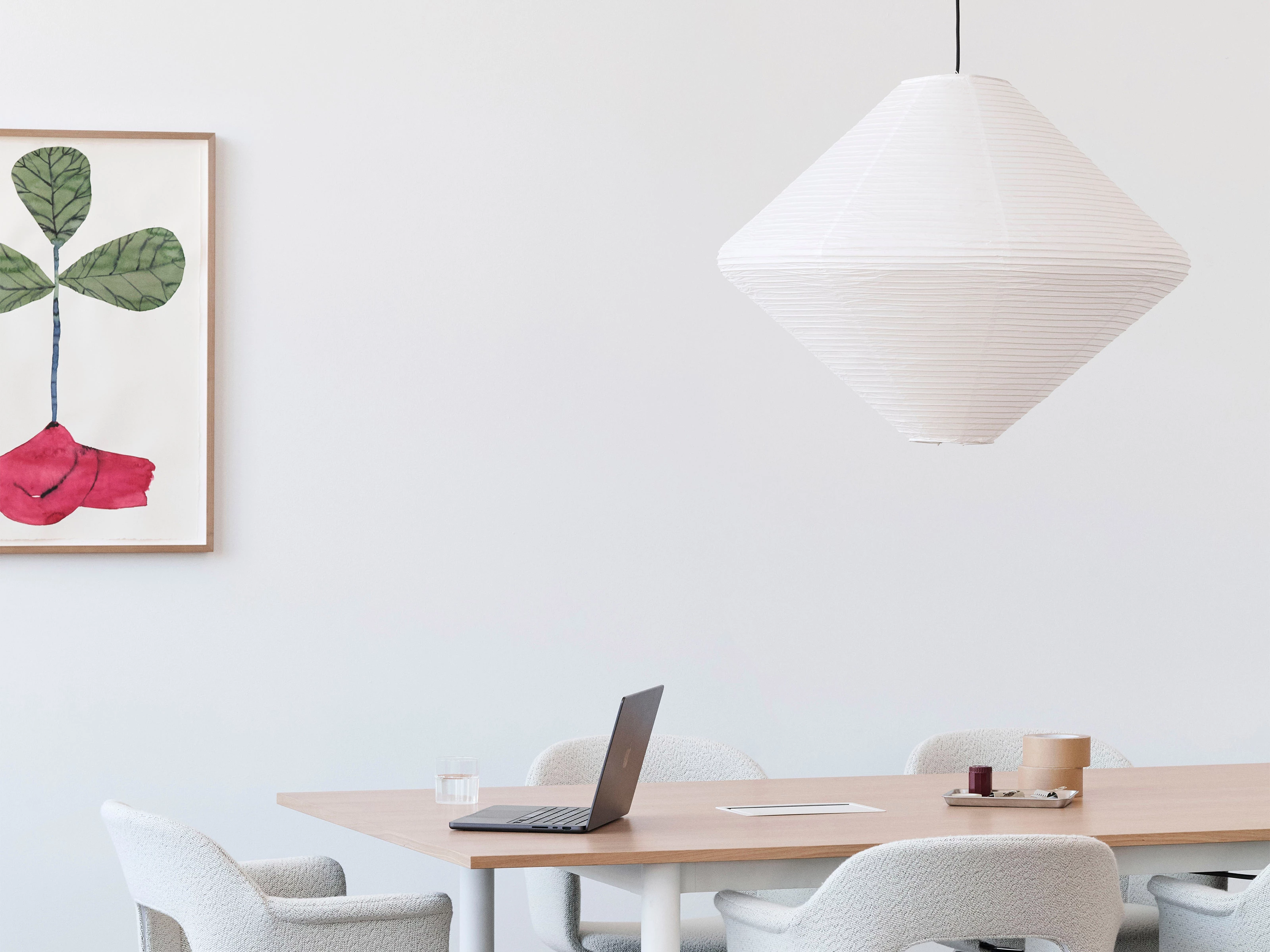A new addition to the HAY Paper Shades collection, this diamond-shaped lamp shade can be used for pendant lights in a range of living spaces to provide soft, diffused lighting with a defined, streamlined aesthetic that can complement other angular decor. Its lightweight paper and ribbed bamboo frame composition bring a delicate, sophisticated touch to any interior.