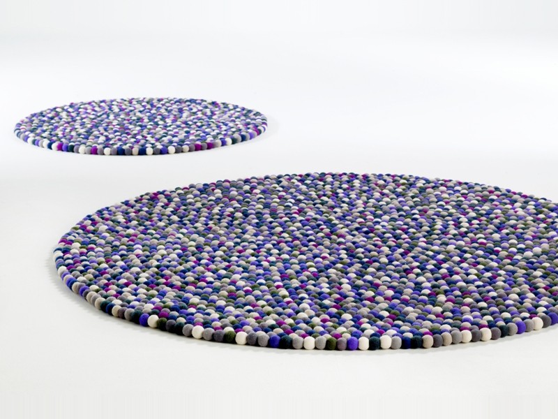 Every single wool ball is felted by hand. Afterwards, the felted balls are put on a string and made into a circular shape to form a one-of-a-kind rug.