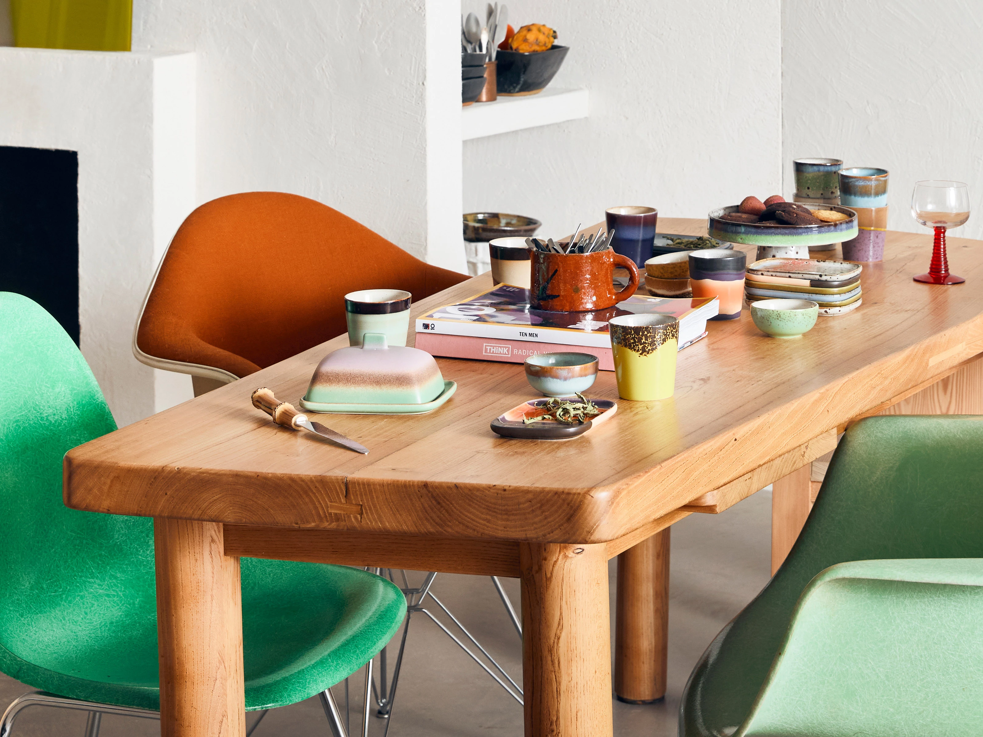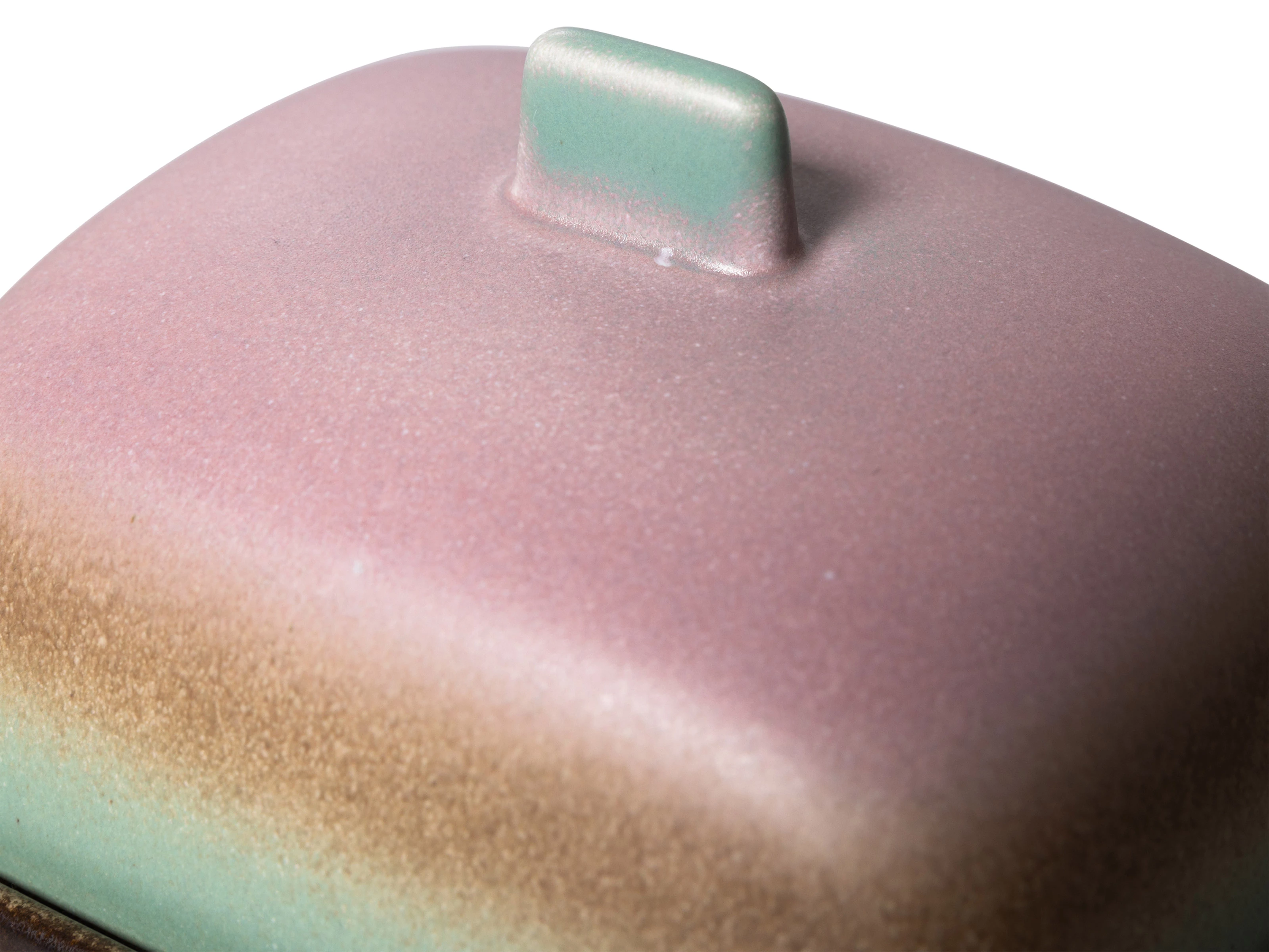 Inspired by the bold creativity of the 1970s, this retro butter dish blends expressive, reactive glazes with sculptural simplicity for an artistic, hand-crafted look. Available in different designs, the piece’s nostalgic character brings a warm, playful spirit to mealtime moments.