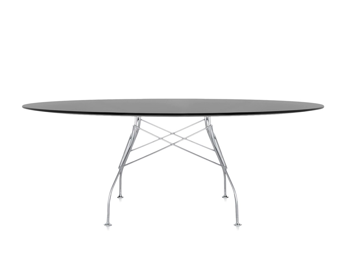 The lacquered table top is supported by a crisscross chromed steel structure, which is both attractive and elegant. It is available in either glossy white or glossy black with a chrome-plated steel frame.