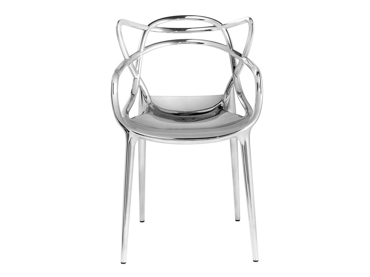 The metallic version of the Kartell Masters Chair retains the distinctive interwoven seat back, depicting the silhouettes of three iconic chair designs. The forms of the Series 7 by Arne Jacobsen, the Tulip Armchair by Eero Saarinen and the Eiffel Chair by Charles Eames are unmistakable, collectively creating an intricate and captivating appearance. With a luxurious metallic finish available in gold, chrome, titanium or copper, light playfully reflects across the surface, further highlighting the distinctive contours. Crafted from recycled material, the chair is lightweight and can be stacked up to four high. Perfect for gathering around a dining table and injecting a unique element into an indoor or outdoor space.