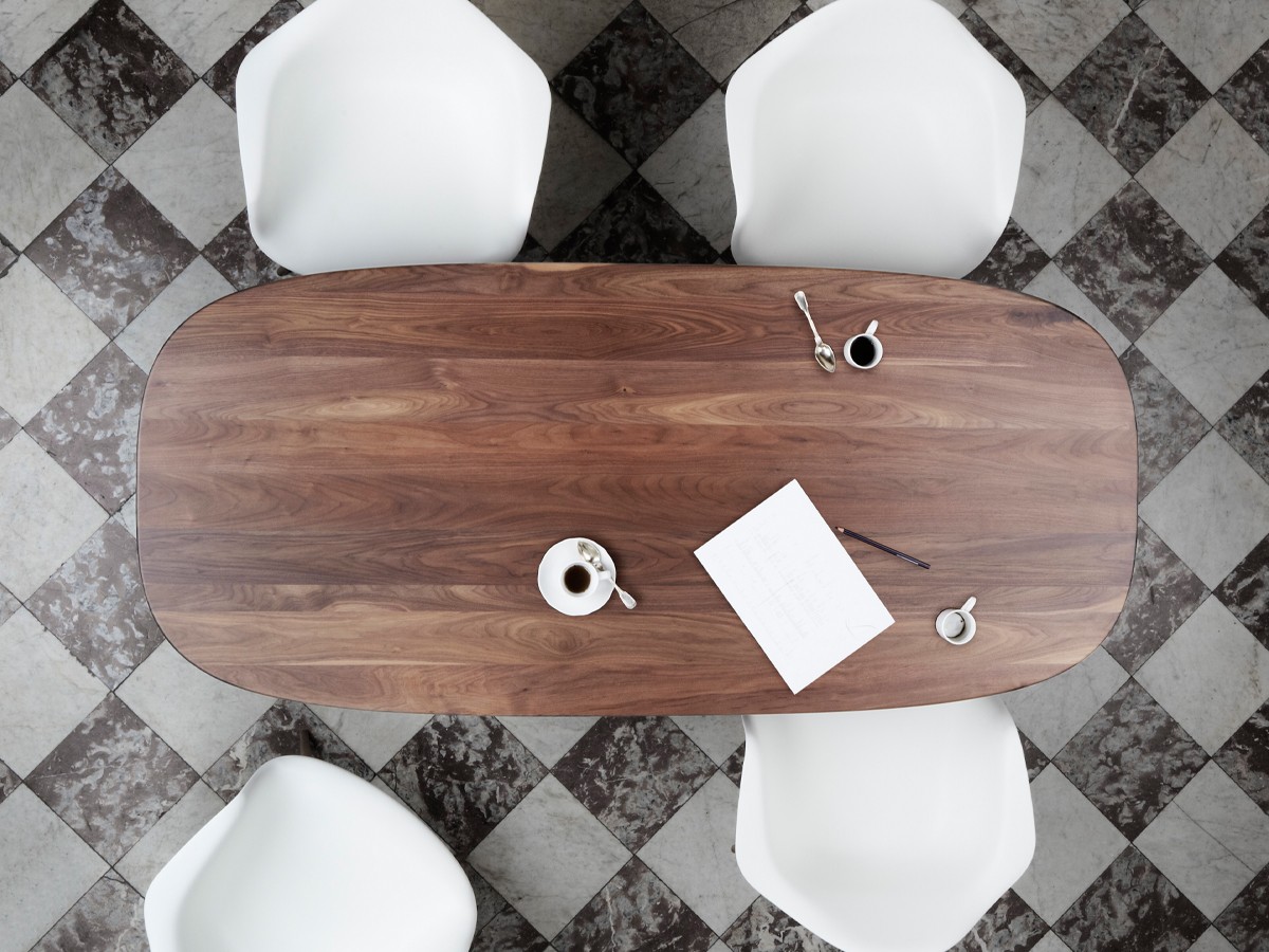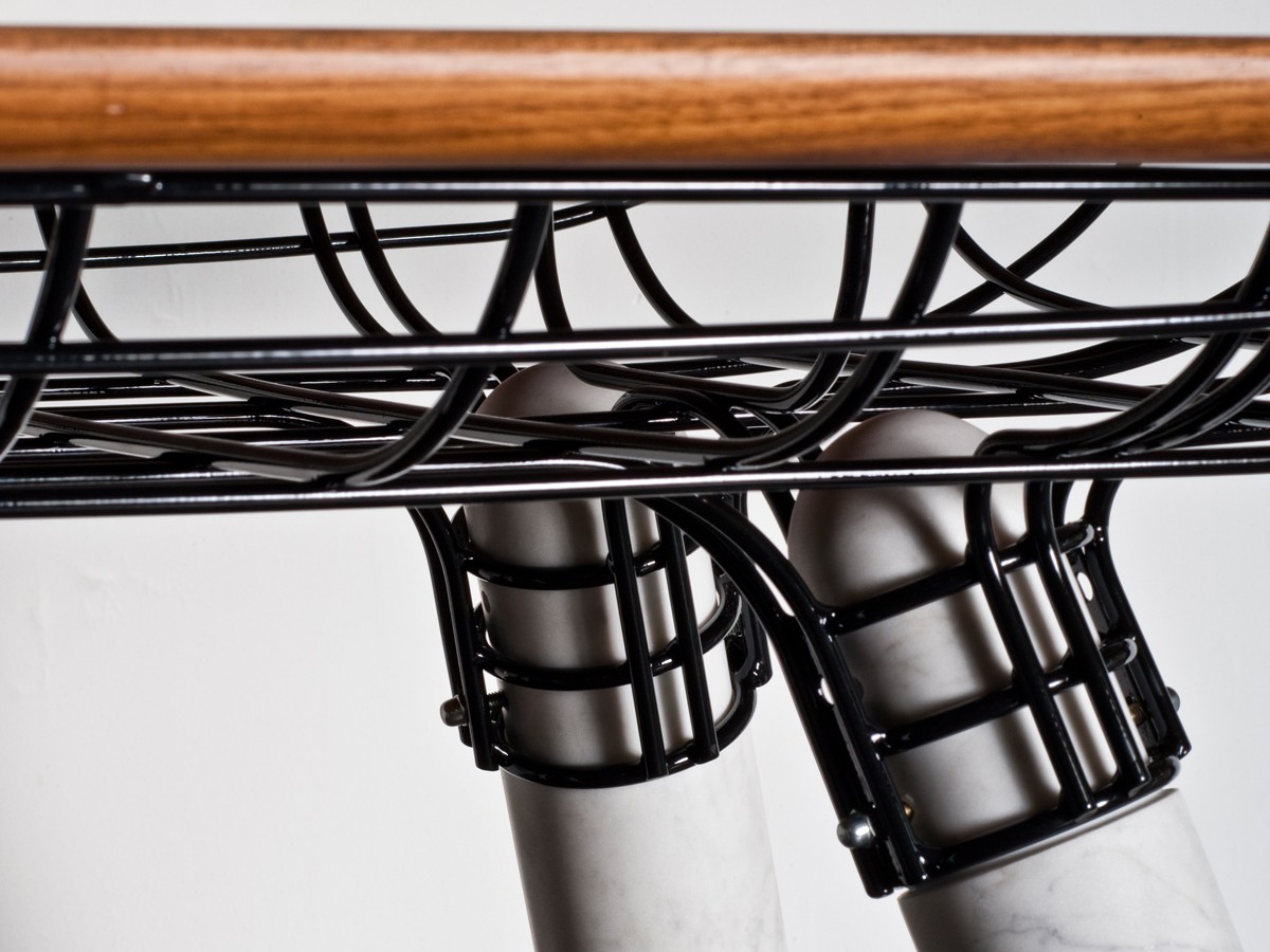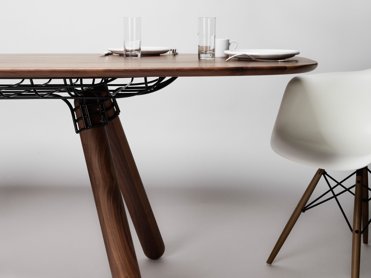 Pierre Favresse chose to use a thin metal matrix linking to thick wooden – or marble - legs to a heavy solid wood table top.