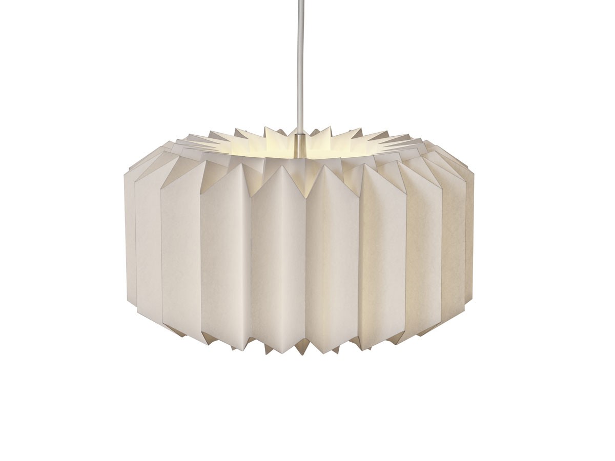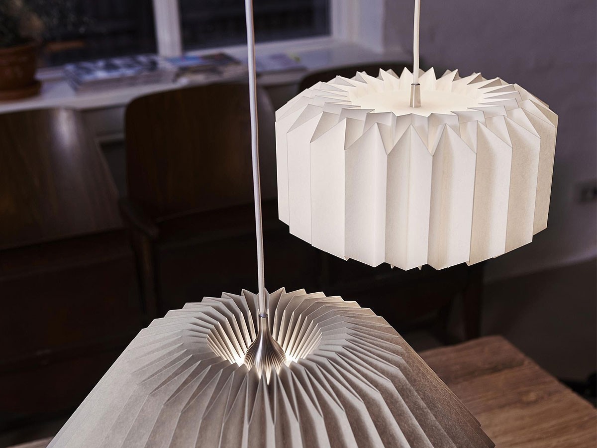 A contemporary take on the classic pleated lampshade, the Onefivefour is defined by it's uniformed wide pleats and flattened, rounded structure, creating both a clean-cut yet soft appearance. Available in two calming colourways, the hand-folded shade, crafted from the finest in colour graded paper, creates a beautiful illumination when flooded with light. Perfect for hanging above a dining or coffee table, the pendant is a delicate piece that embodies timeless design and expert craftsmanship.
