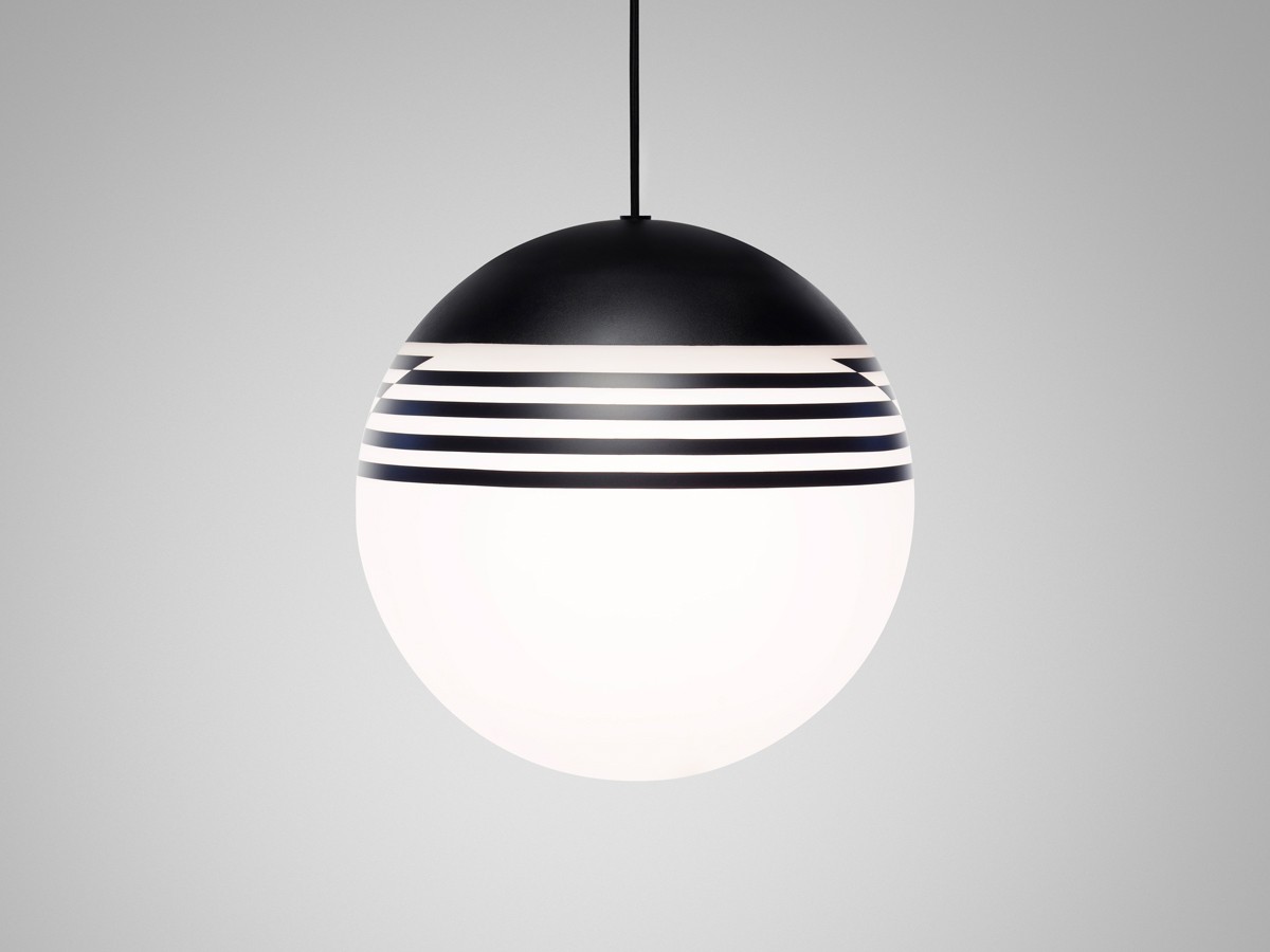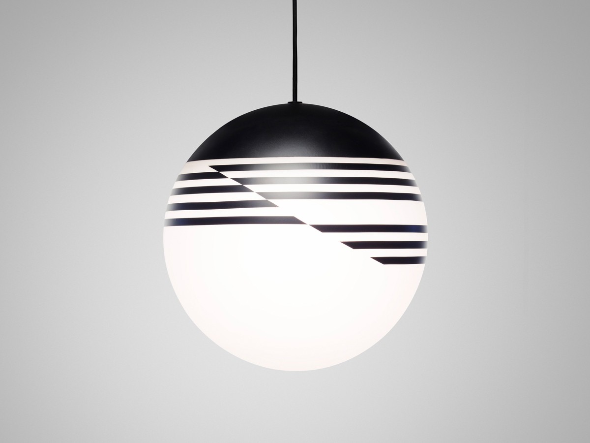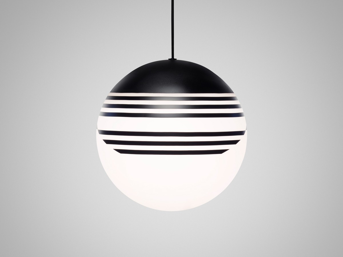 Made from powder coated spun steel and opaque glass, the asymmetry of the black stripes are in contrast to the classic spherical shape of the globe. Optical's linear pattern changes at every angle.