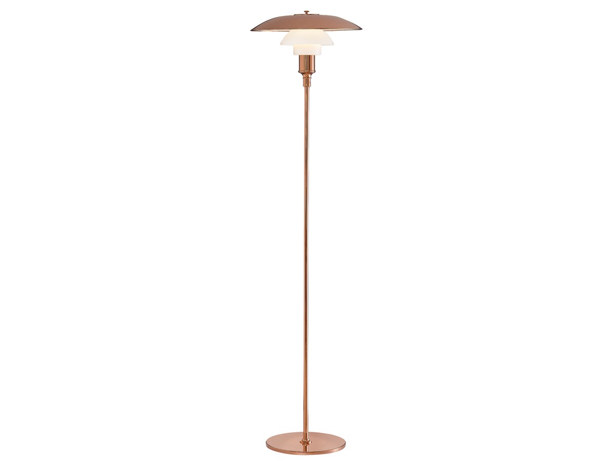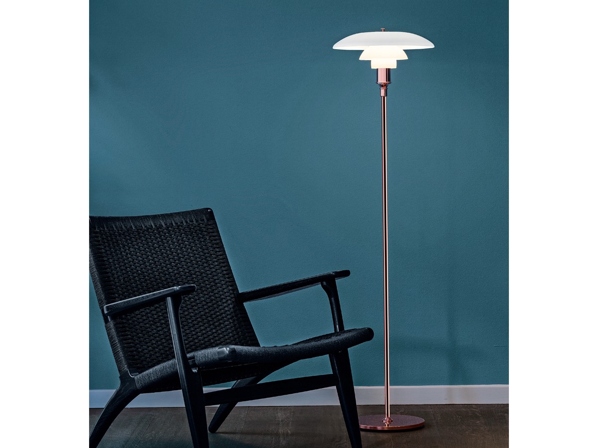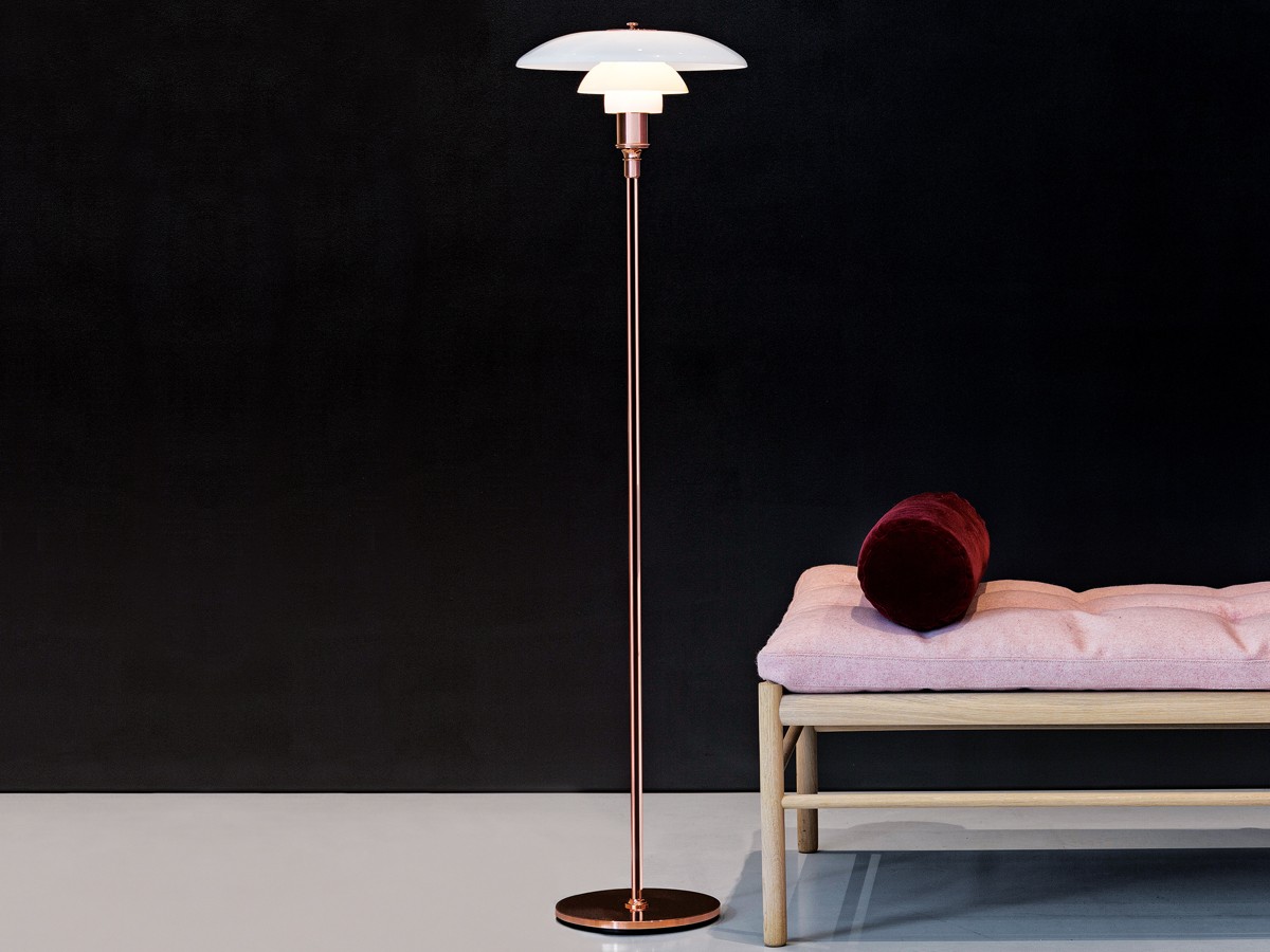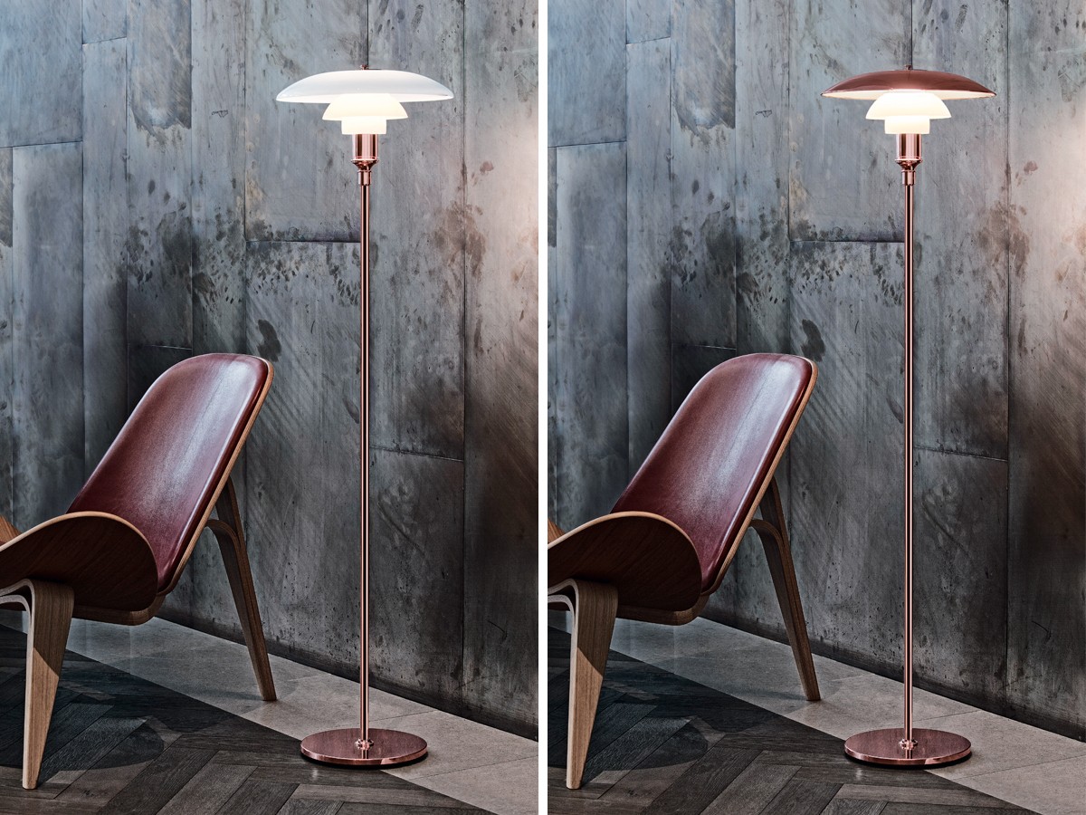 This special version of the PH 3½-2½ floor lamp comes with two different top shades – one made of mouth-blown opal glass and one made of polished copper. Together with the two lower shades – also made of opal glass – the opal glass top shade provides pleasant, diffuse lighting, while the solid copper top shade provides more downward directed, soft lighting.