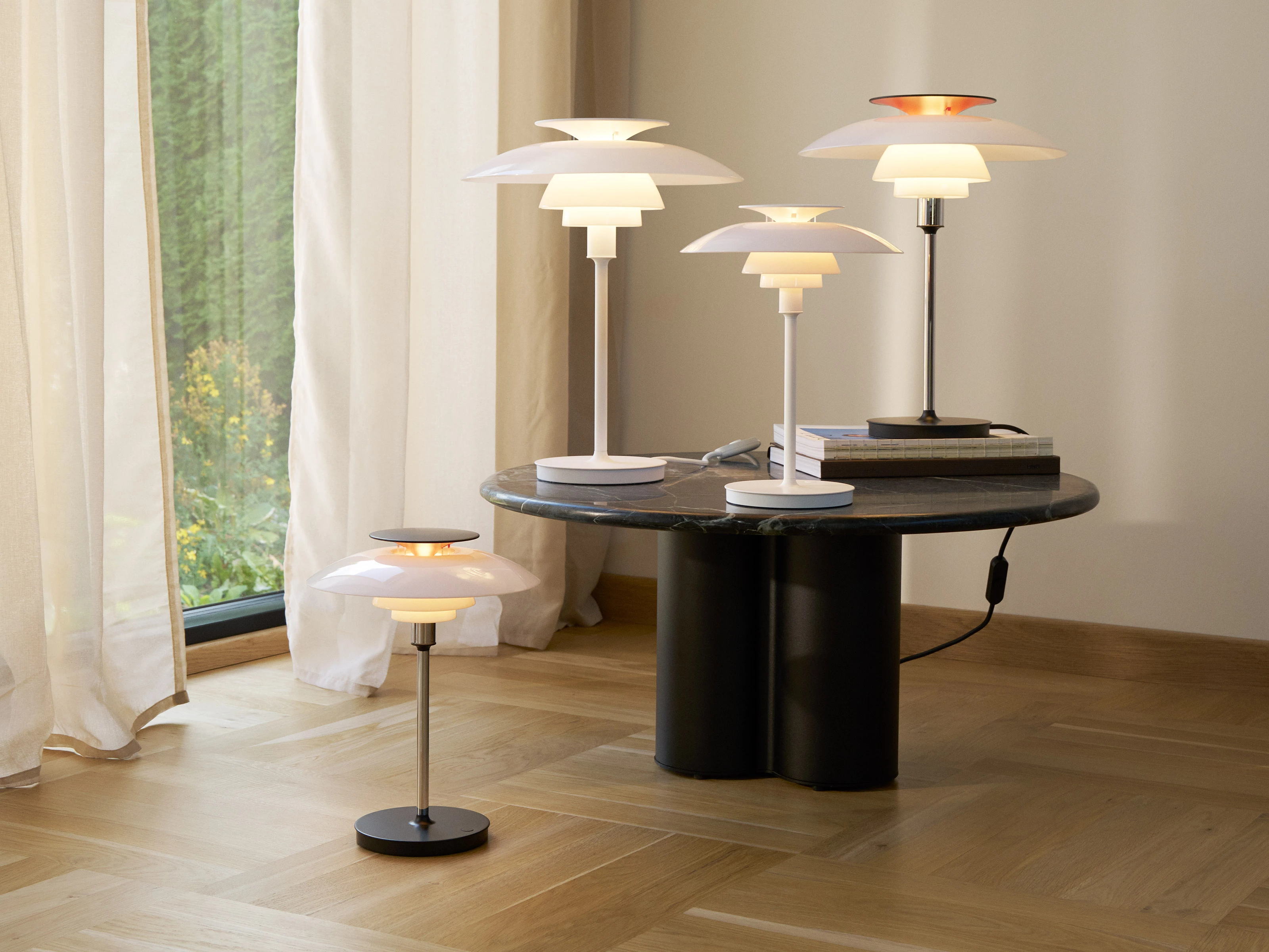 Boasting a built-in four-step dimmable LED and available with a clean white or classic red-top finish for a warmer ambient glow, the PH80 Portable Lamp can be taken anywhere to provide a functional, comfortable light, while its dim-to-warm technology mimics the warmth and cosy radiance of traditional incandescent bulbs.